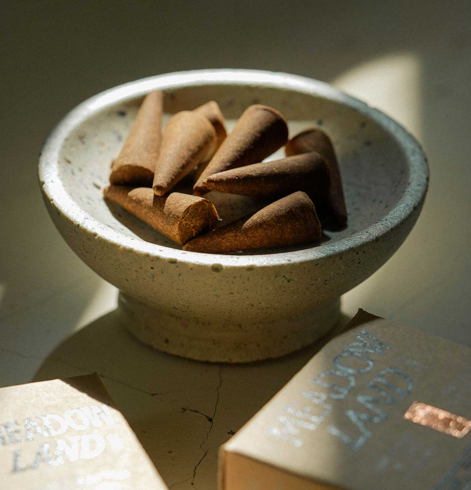 A natural incense that evokes clear light and wide landscapes. Meadowland releases soft smoke infused with dried herbs, hay, and a trace of soil. It fills a room without overwhelming it, offering stillness in the air.