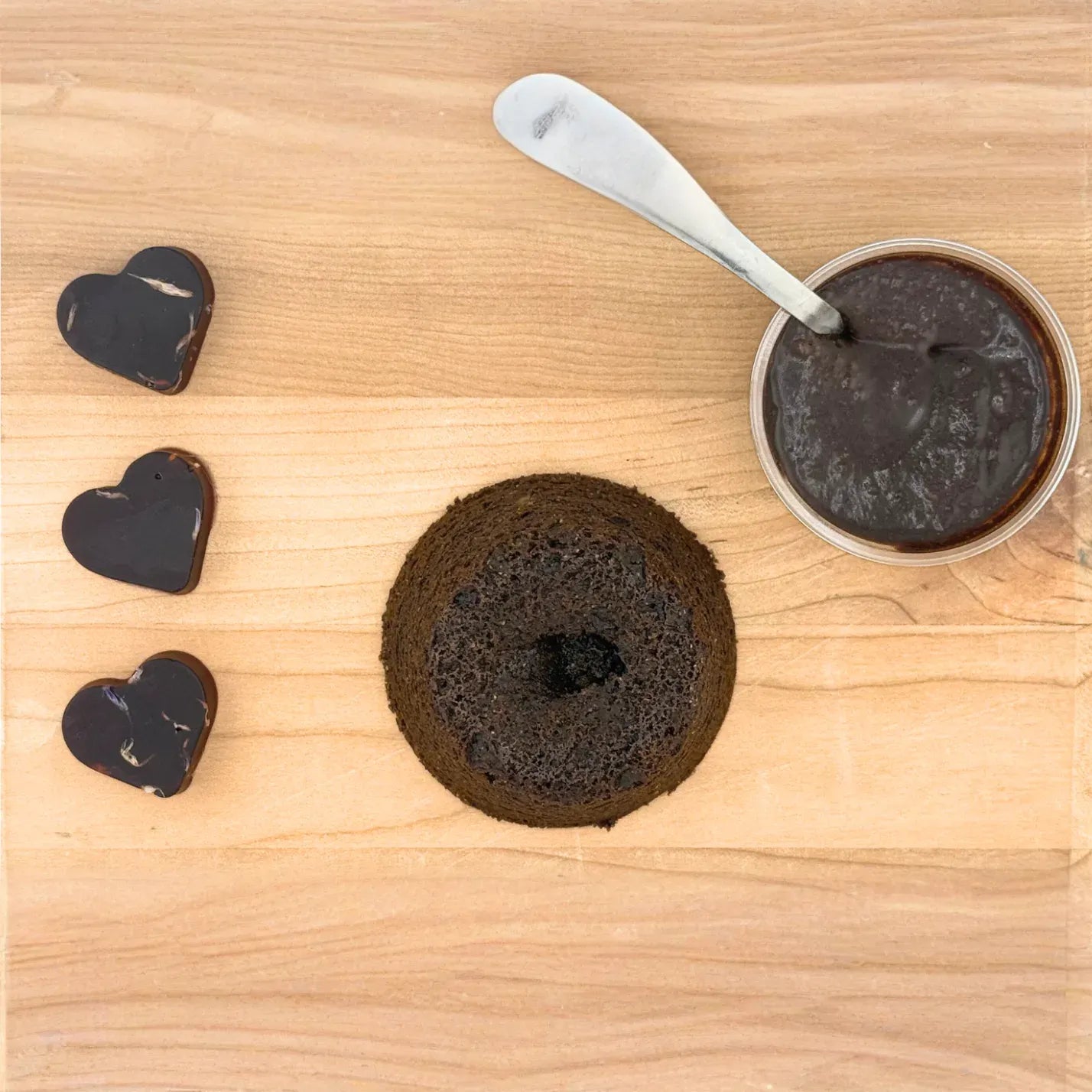 Ingredients: Cake - Eat G.A.N.G.S.T.E.R's Chewy Choconot brownie mix (tigernut flour*, tapioca flour, carob powder, grass-fed gelatin, sea salt, baking soda), coconut milk*, carob powder*, maple syrup*, avocado oil*, coconut butter*, dark cherries*, coconut oil*, baking soda, Himalayan pink salt, Sauce - coconut milk*, carob powder*, maple syrup*, Gummies - tart cherry juice (not from concentrate)*, maple syrup*, grass-fed beef gelatin*