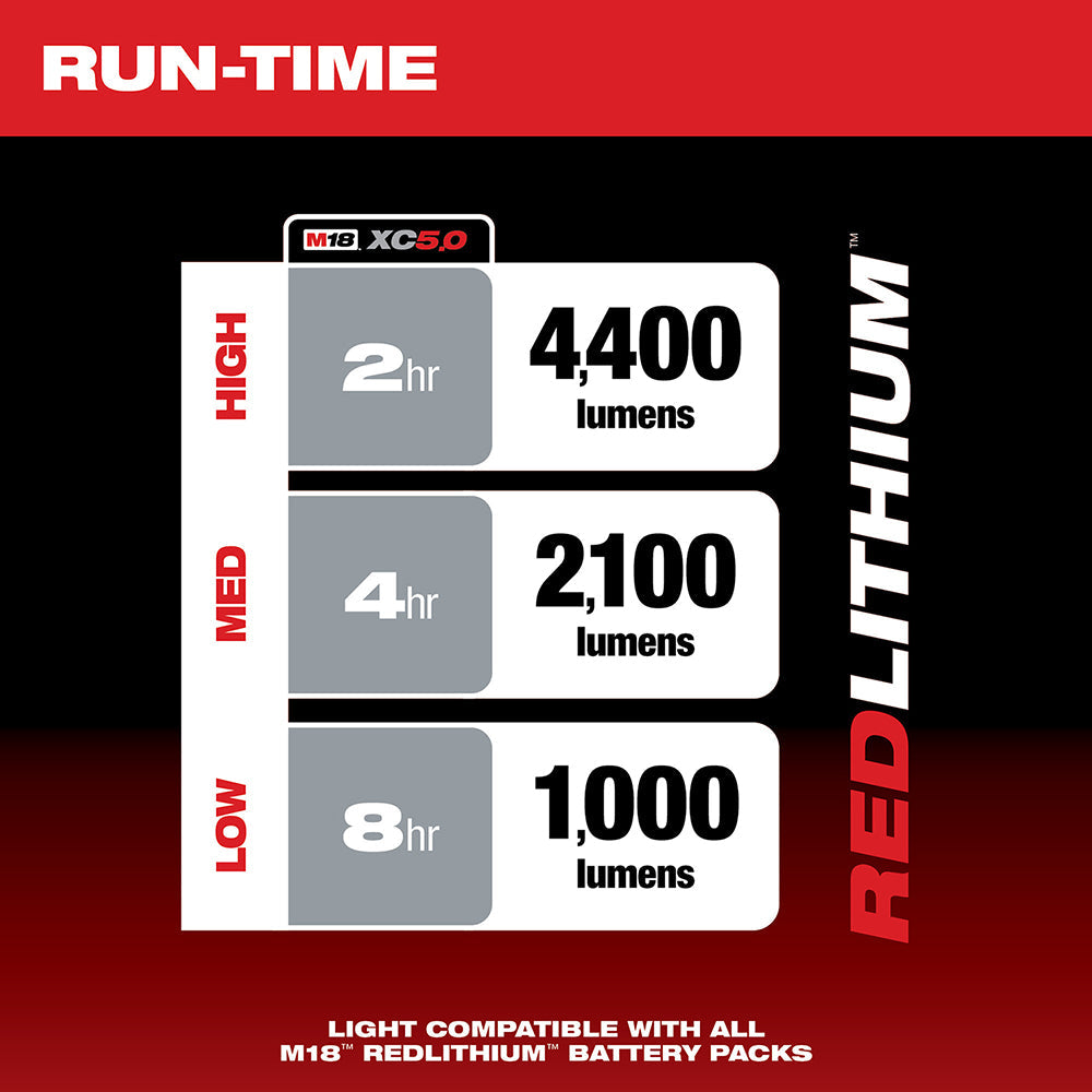 Weight: 12.8lb Warranty: 5 Years (Tool), Limited Lifetime (LED) Lighting for task, area, and overhead 4,400 lm for maximum coverage High impact polycarbonate lens AC in and out: string up to 10 together, protected AC plugs Self-centering hang hook, reinforced hang hole 180 and 360 electronic light control Low battery indicator Protected AC plugs Reinforced hang hole Includes (1) security cable M18 REDLITHIUM high demand 9.0 battery pack delivers up to 5X more run-time, 35% more power, and runs 60% cooler than standard 18-Volt lithium-ion batteries