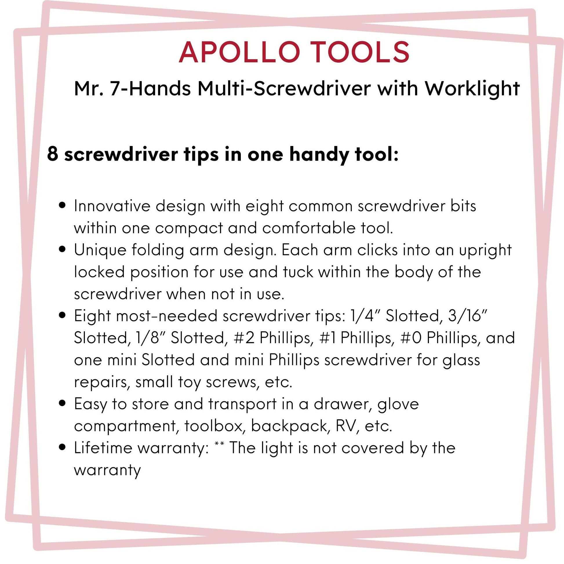 APOLLO TOOLS’ PATENTED Mr. 7-Hands multi-screwdriver has a unique folding arm design. Each arm folds down and clicks as it is tucked within the body of the screwdriver when not in use, and clicks into an upright locked position for use.