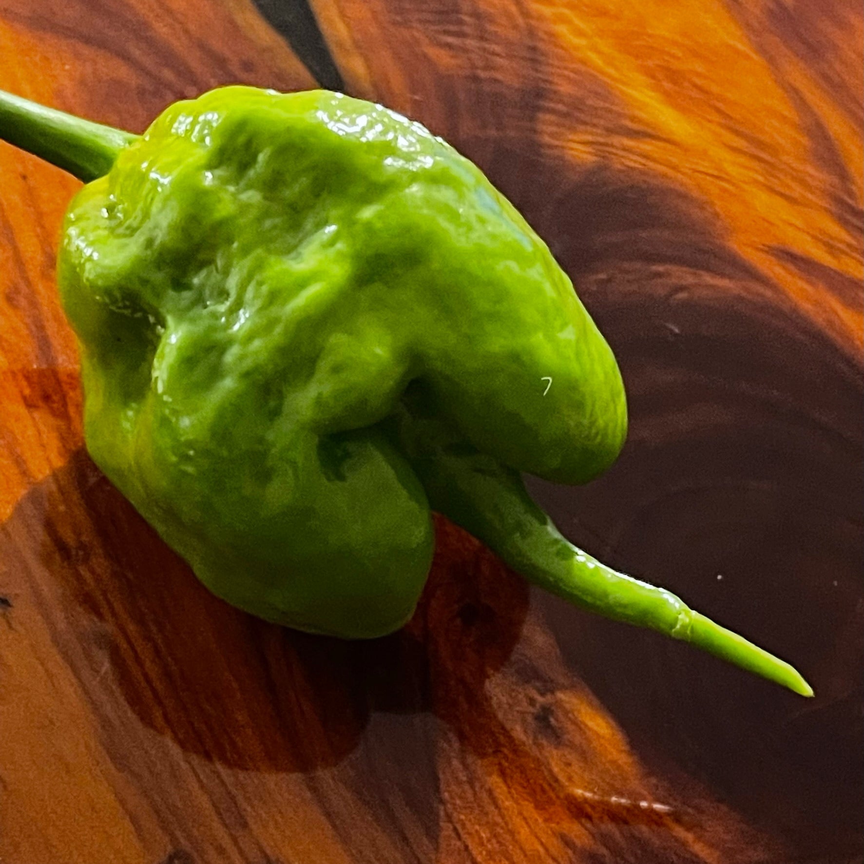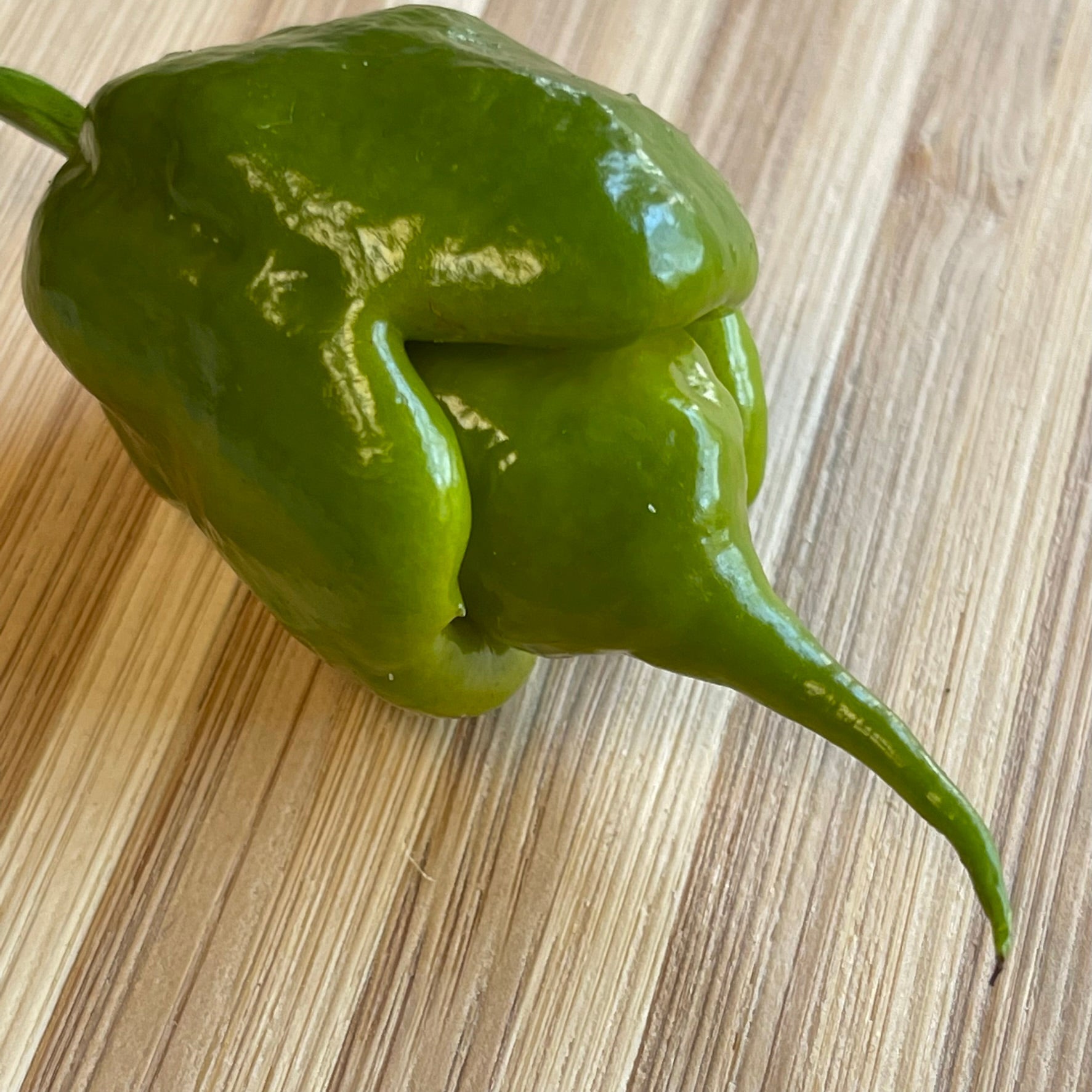 The Mustard Carolina Reaper is a rare strain of the Carolina Reaper pepper, which is currently the hottest pepper in the world, according to Guinness World Records since 2013. Starts off a bright green and deepens into a yellowish green the longer it ripens. This is still a very new strain so the tails can differ quite a bit. Pods are smoother than the original Carolina Reaper. Hotness level is a little less than the original Reaper and has a slightly earthy tones. Plants are very productive and will reach 4-5 feet tall.