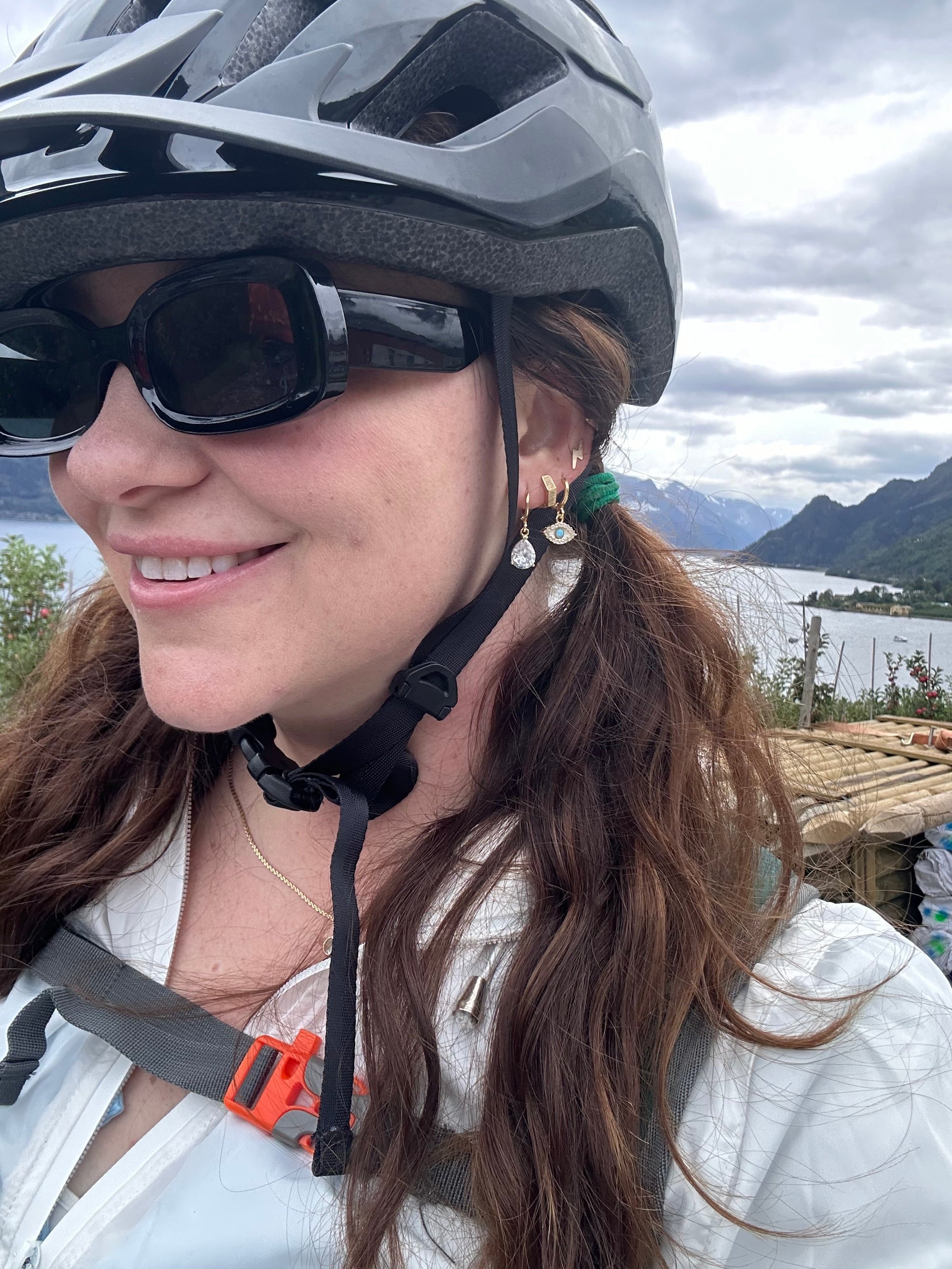 Simulated Opals and 14k gold-filled findings; evil eye huggies.