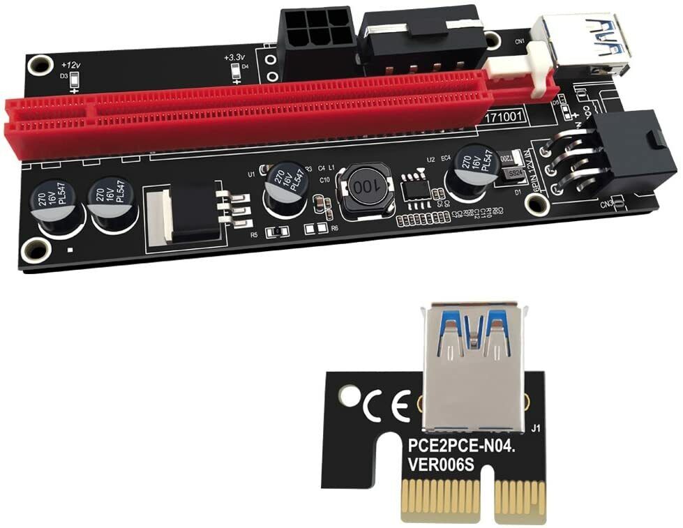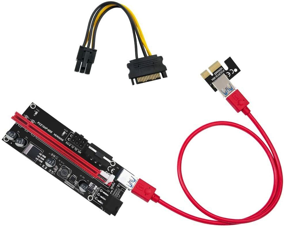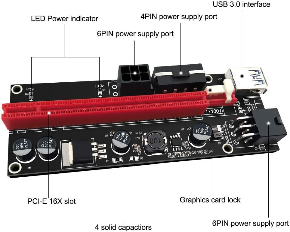Includes 2 x 6 pin ports and 1 x Molex port for powering which provides Graphic card independent power and reduces motherboard burden when using more Graphic cards. 4 Solid Capacitors, 60cm USB 3.0 cable, Suitable for all Operating Systems. Model: 009S Color: Black USB Version: USB 3.0 USB Cable Length: 60cm Type: PCI-Express Cable Power Connector: 2 x 6Pin,1 x Molex Capacitor Type: Solid Power Cable: 6pin to SATs.