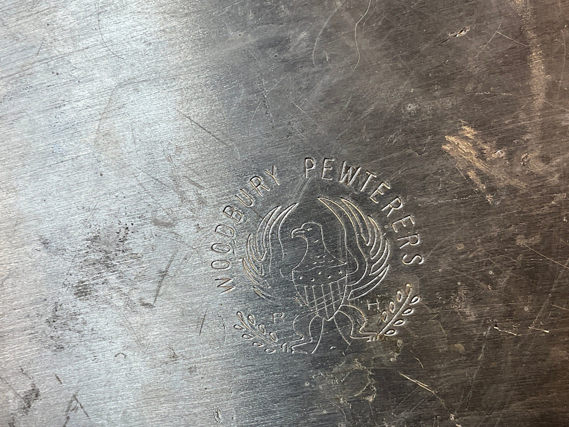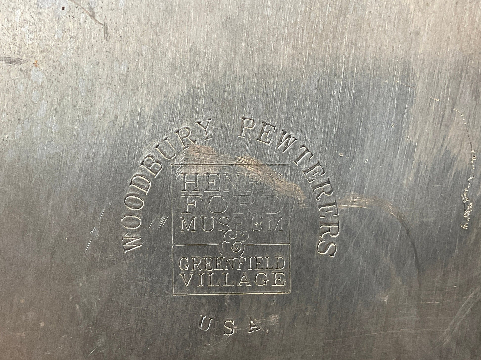 WOODBURY PEWTERERS TEAPOT: At the Henry Ford Museum in Dearborn, Michigan, you can see the original 1820 teapot that this reproduction is based on. This particular replica was created by Woodbury Pewterers. Woodbury Pewterers was founded in 1952 in the town of Woodbury, CT, by Ruth Holbrook and Lee R. Titcomb. Each piece of Woodbury Pewter is hand-crafted from the highest quality pewter using many of the same methods and tools that were used in the 18th & 19th centuries. This vintage teapot measures 7 1/2" high x 9 1/2" wide.