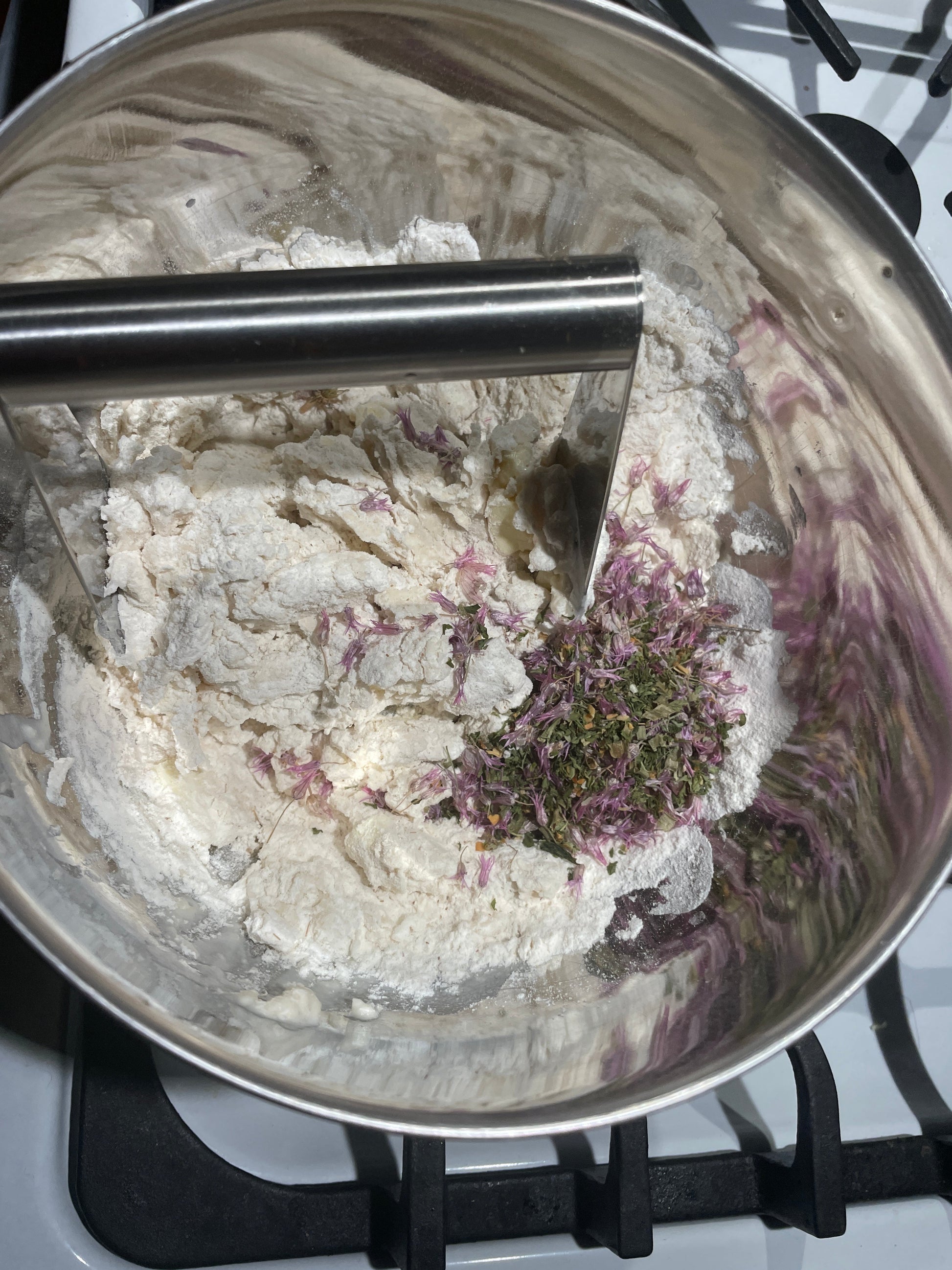 ½ Cup Whole Milk 2 Tbsp Cubbed Butter 1 Packed Chopped Chives & Flowers 1 Package Dumpling Mix