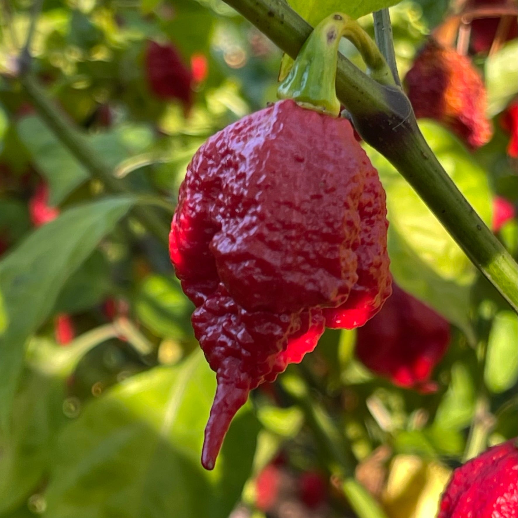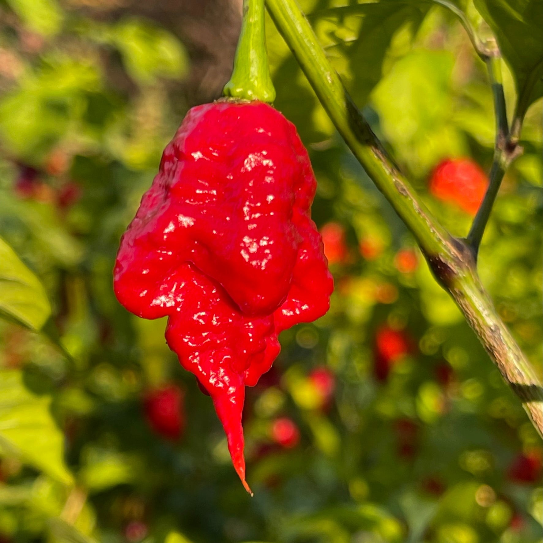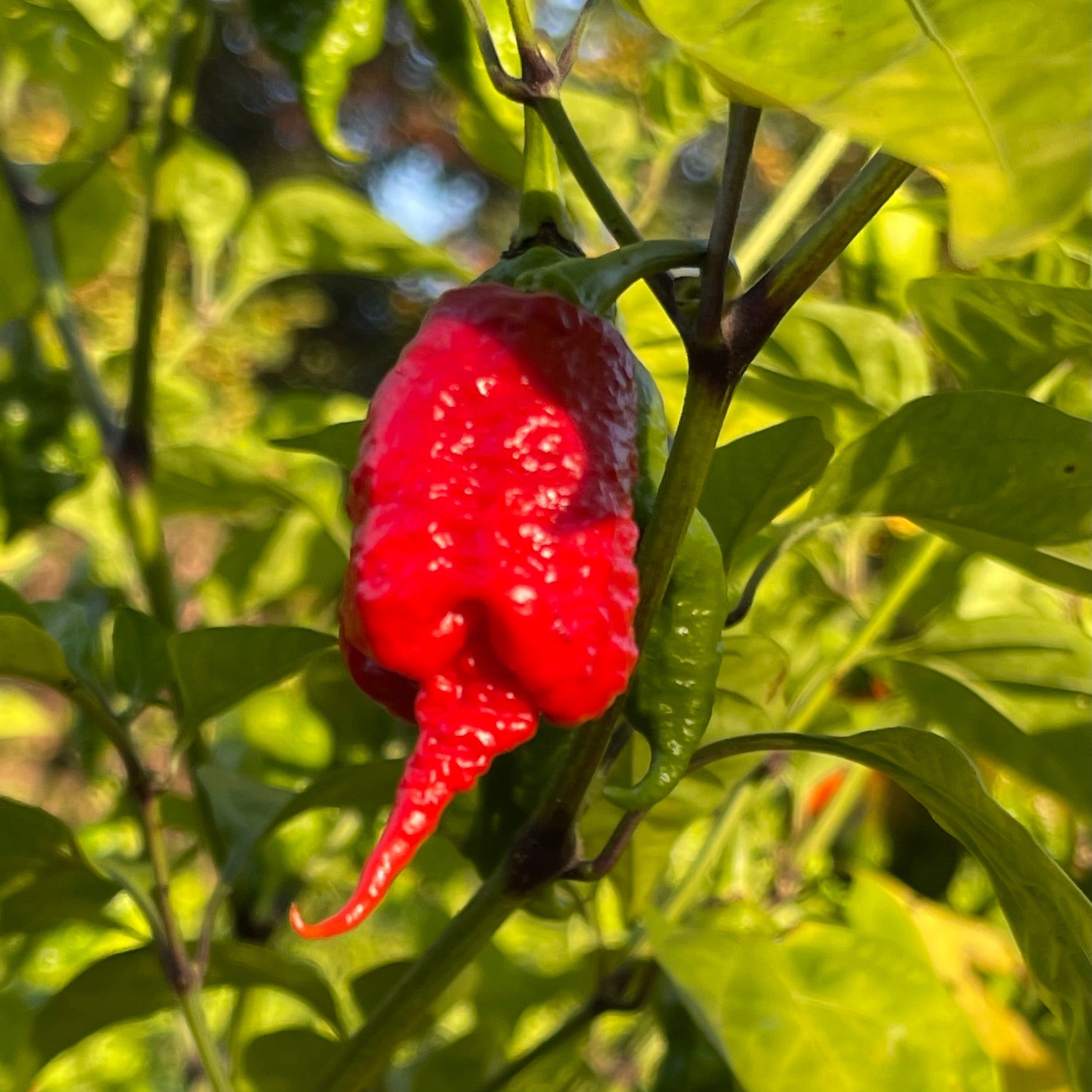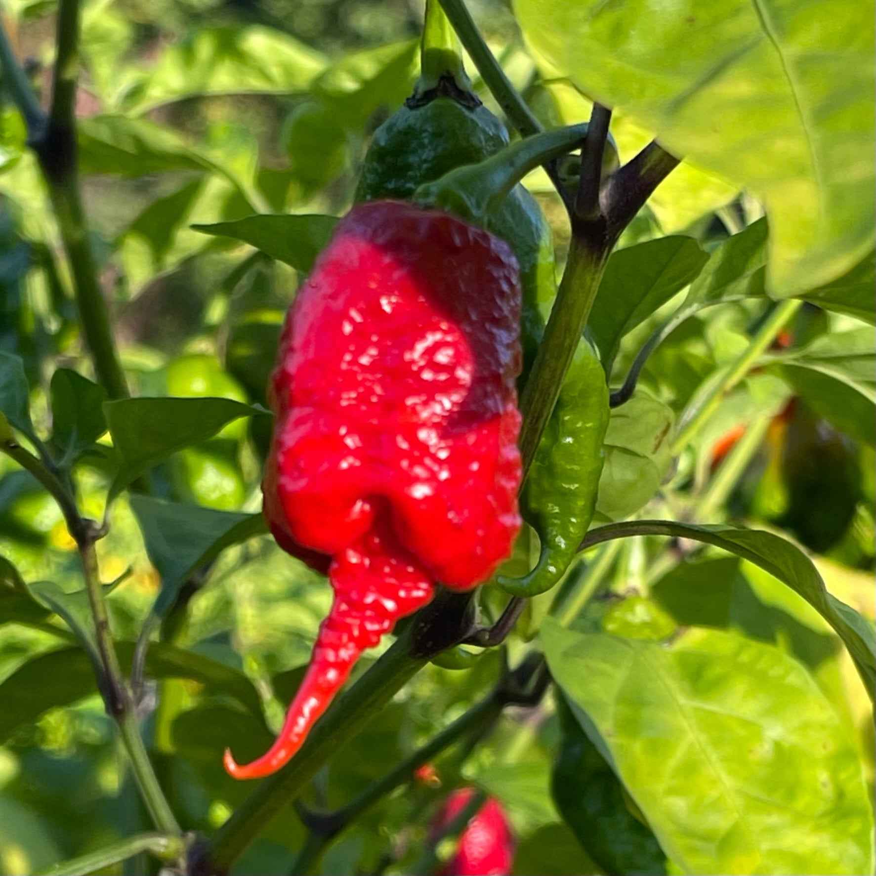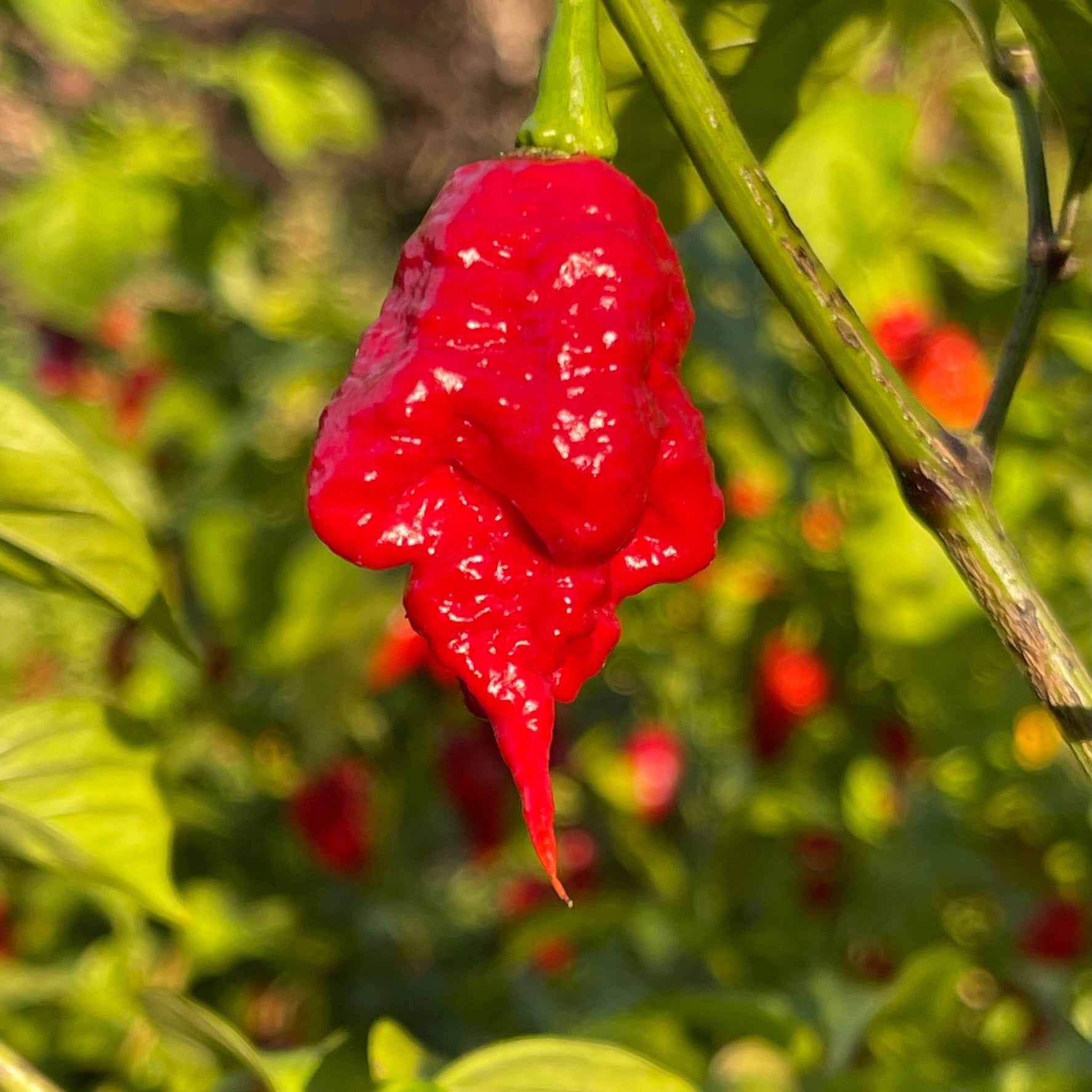 The SRTSL x Carolina Reaper pepper is a blisteringly hot hybrid blending the legendary Carolina Reaper with the SRTSL (Sara R. Trinidad Scorpion Long). Originally created by Paul Willet and further refined by Giancarlo Fadda of Fadda's Peppers, this cross is renowned for its extreme heat, surpassing 2,000,000 Scoville Heat Units, and its unique visual appeal. The pods are relatively small but distinguished by extraordinarily long tails, often exceeding the length of the pod itself, giving them a striking, lantern-like appearance. Ripening from green to vibrant red, the peppers are thin, elongated, and slightly wrinkled, resembling a slender Reaper. The plants grow to about 3-4 feet in height, thrive in pots, and produce prolific harvests. While generally stable, occasional variations in pod shape may occur.