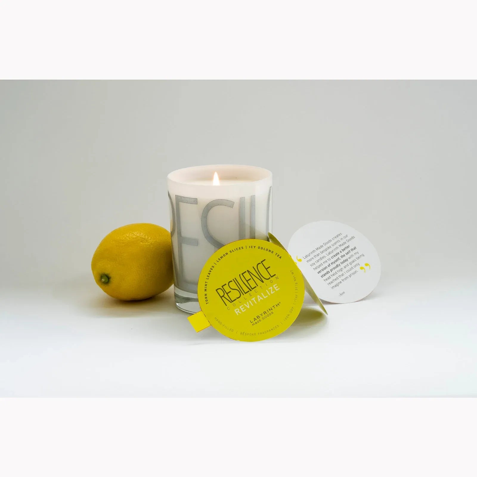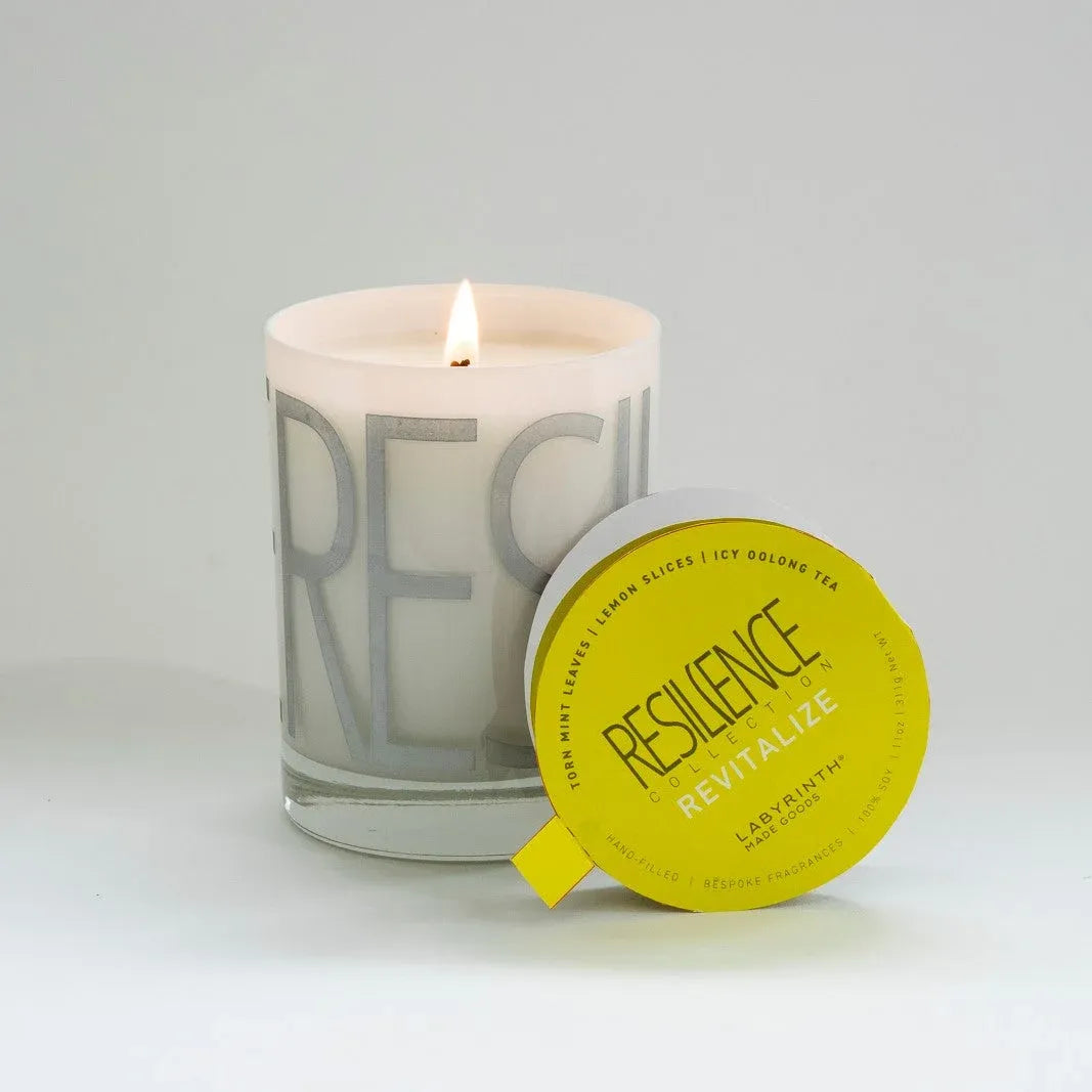 Our large Revitalize candle is filled in a beautiful, custom glass vessel with the word "Resilience" wrapped around to honor the resilience we can find within ourselves. Each of the larger candles has an estimated 60-hour burn time and a net weight of 11oz.