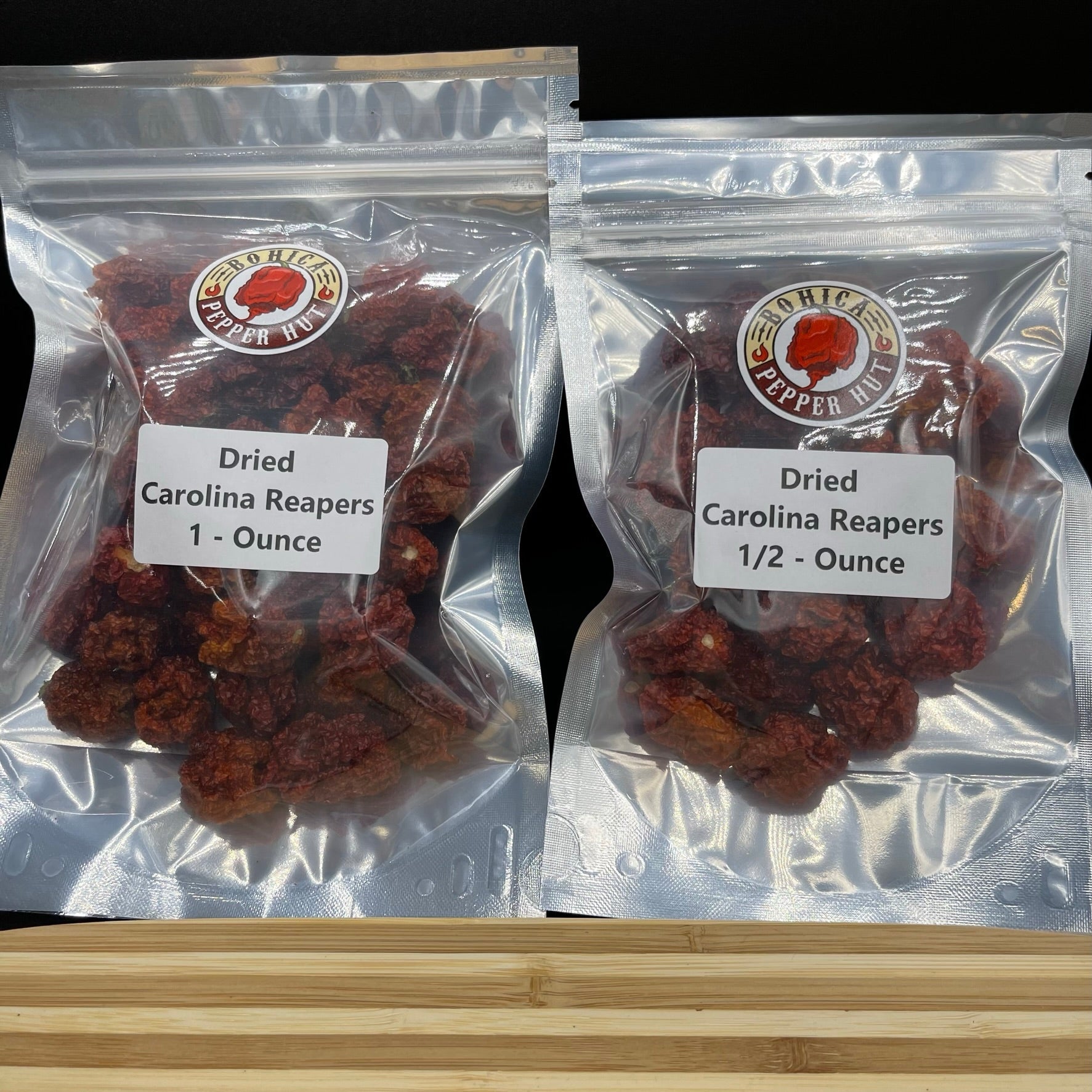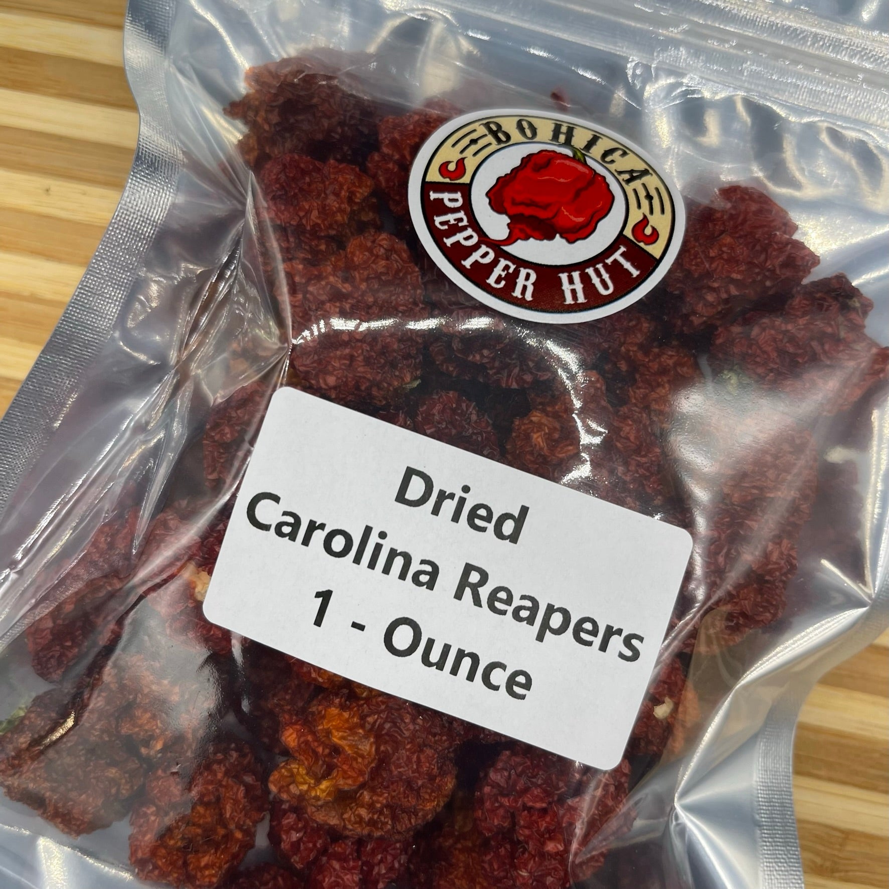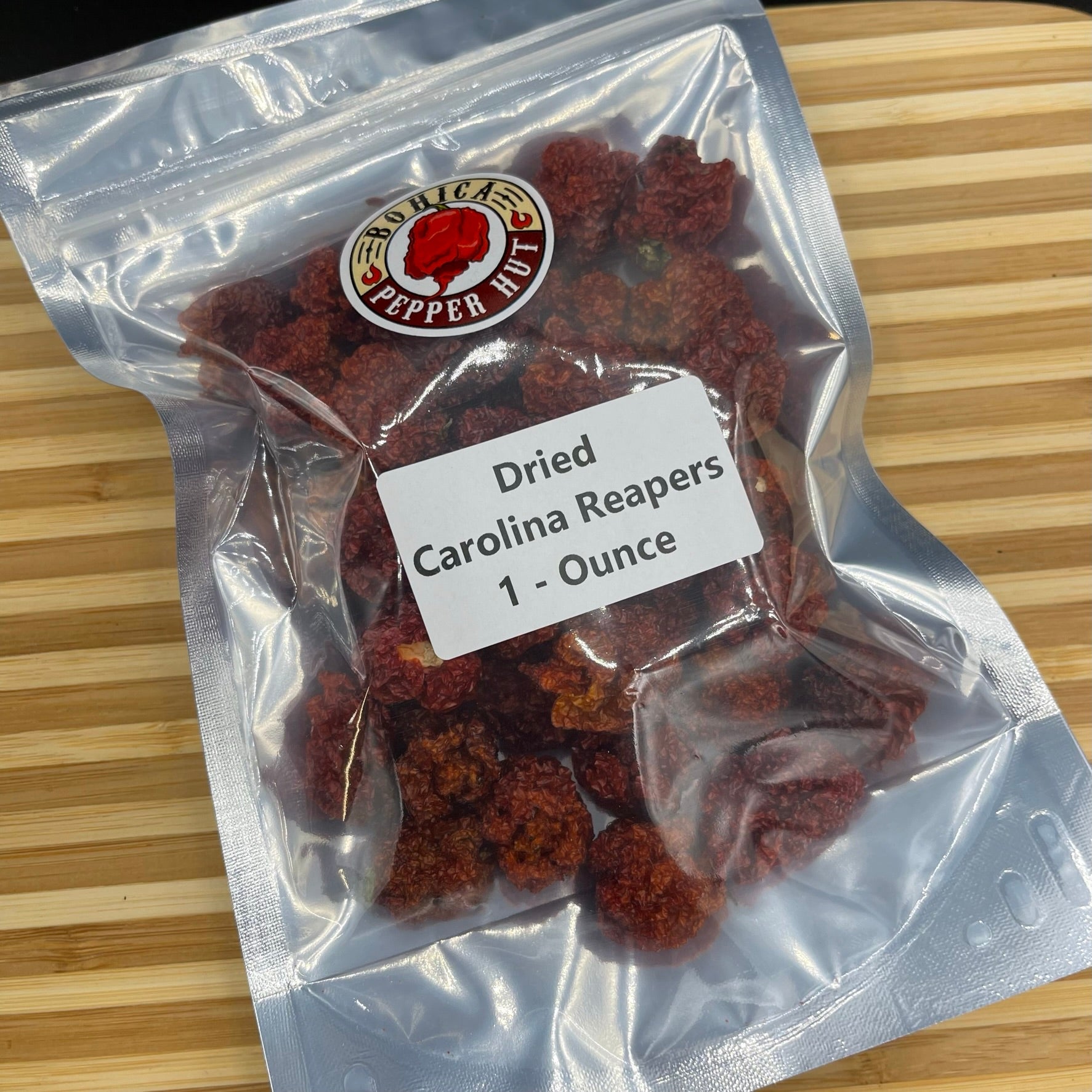 Premium Whole Dried (Dehydrated) Carolina Reaper Peppers from our most recent crop.