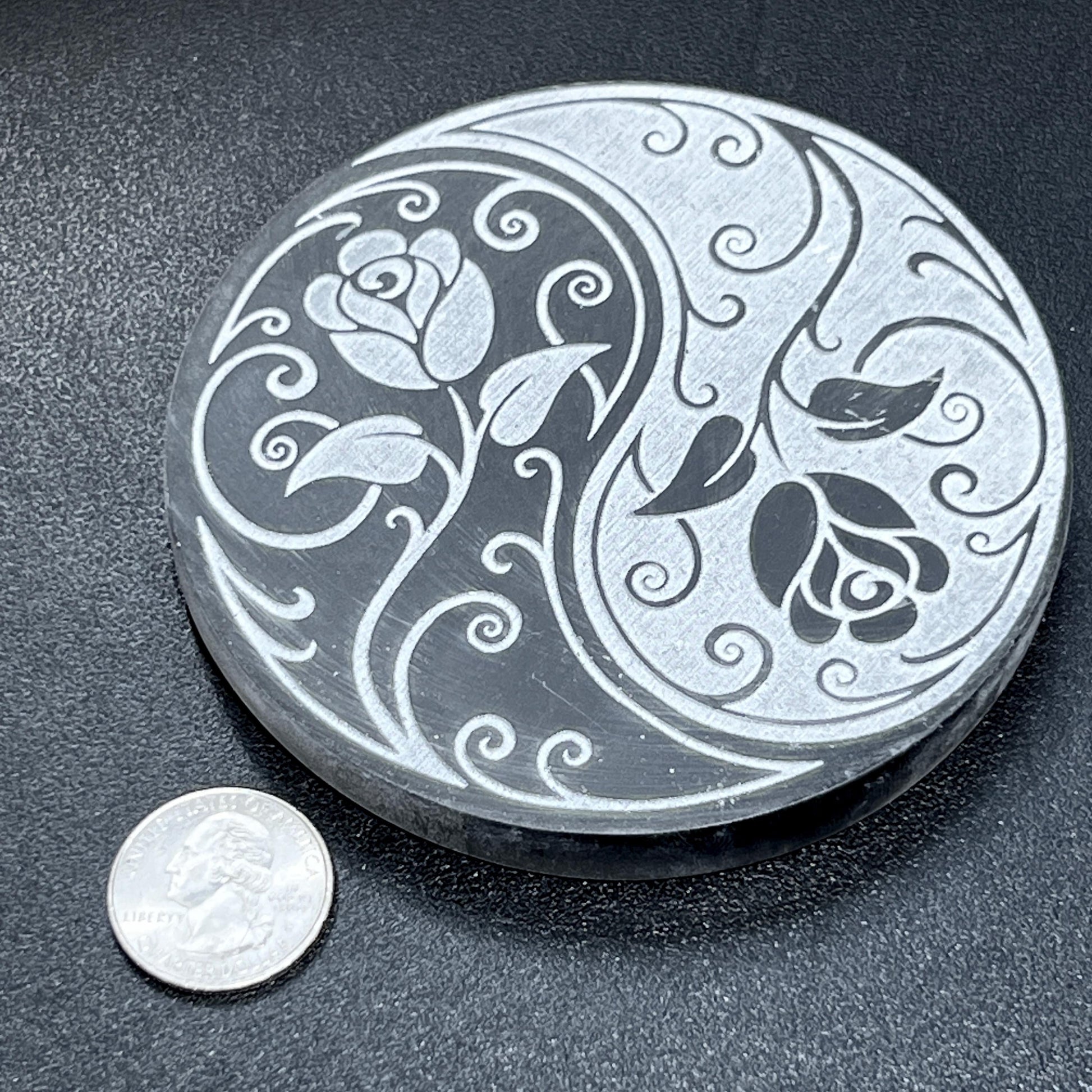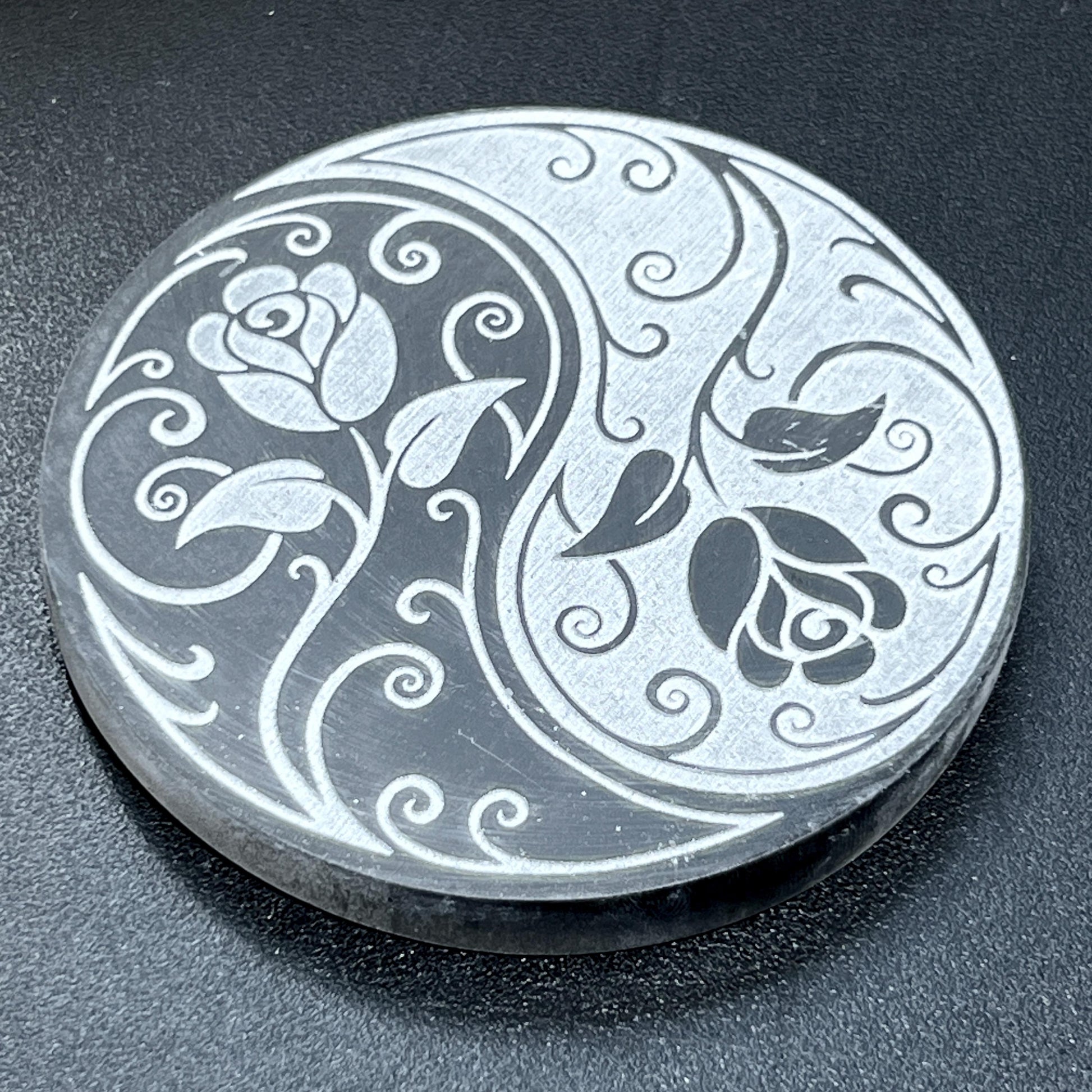 Round Selenite Crystal Circle Plate With Rose Yin Yang Engraving