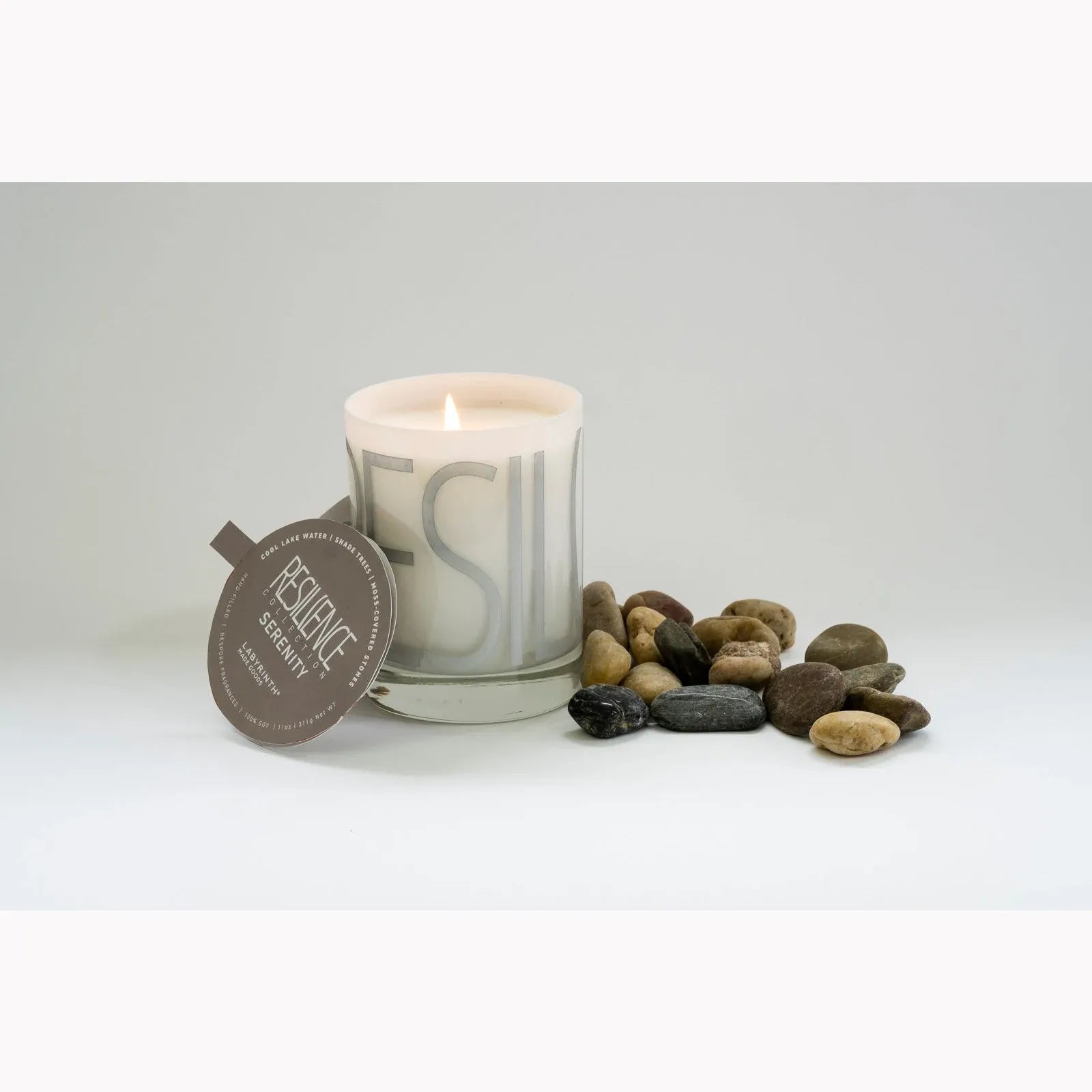 Our large Serenity candle is filled in a beautiful, custom glass vessel with the word "Resilience" wrapped around to honor the resilience we can find within ourselves. Each of the larger candles has an estimated 60-hour burn time and a net weight of 11oz.