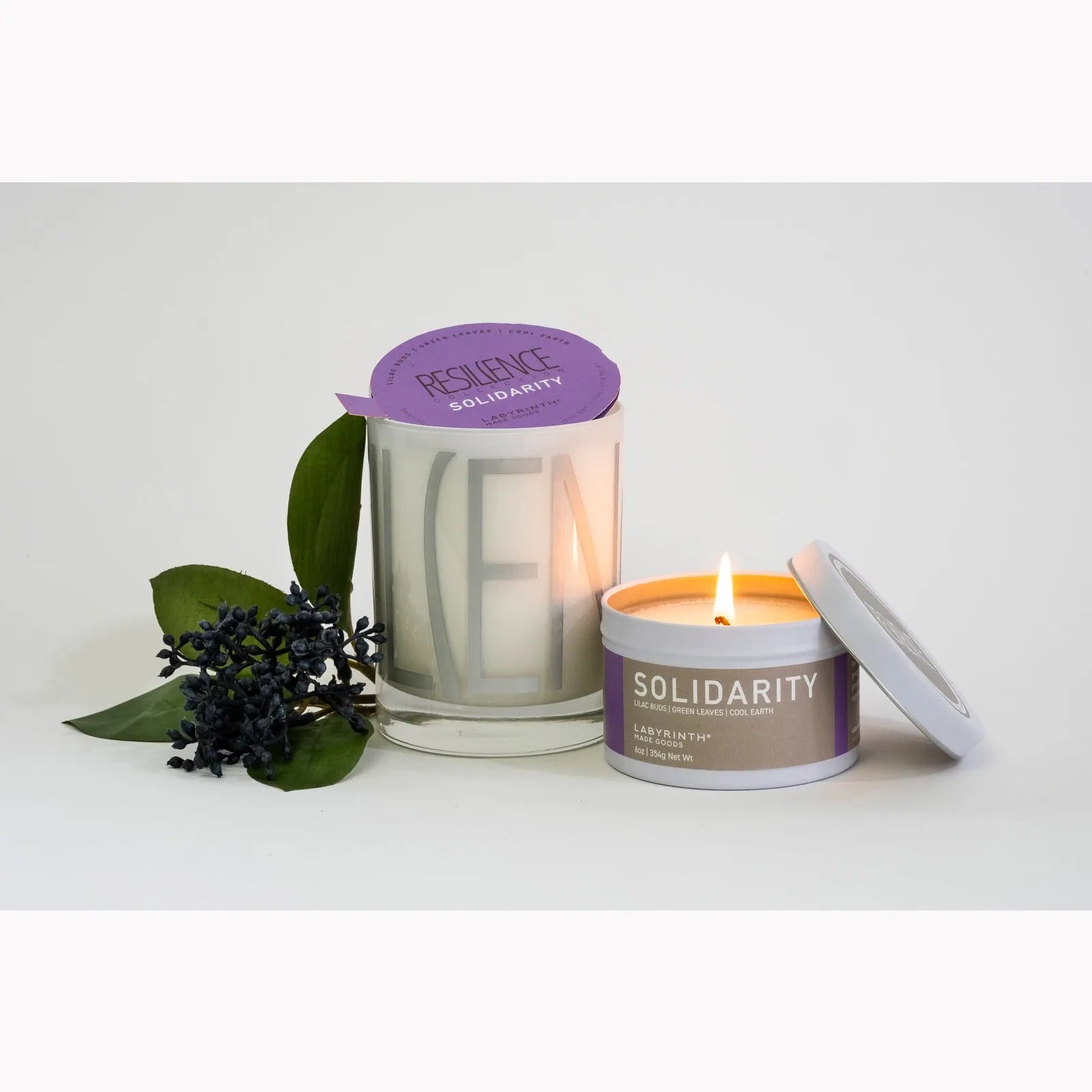 Our smaller Solidarity candle comes in a white tin for convenient travel. Each of the smaller candles has an estimated 35-hour burn time and a net weight of 6 oz.