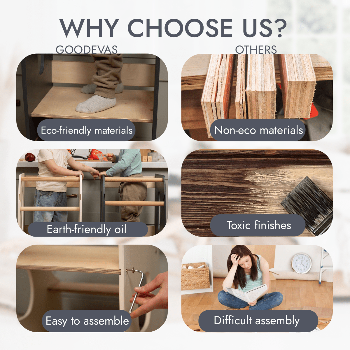 Eco-Friendly Materials: Made from natural wood and finished with non-toxic paints, this learning tower is completely safe for your child and an environmentally responsible choice.