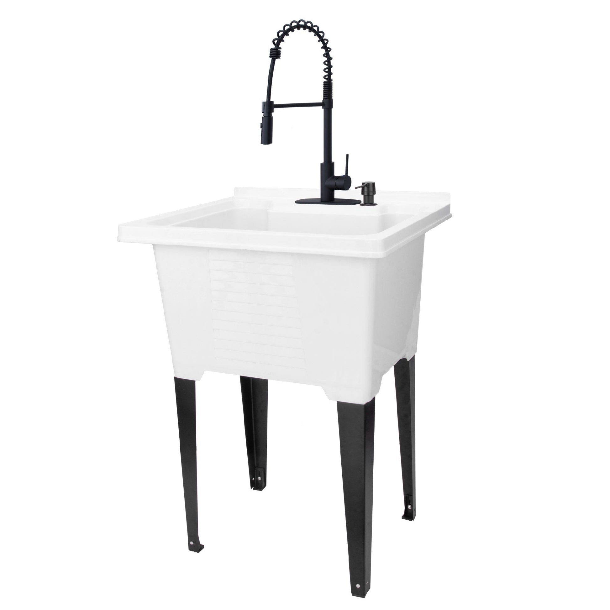 This freestanding Tehila Luxe Utility Sink comes with everything you need to update your laundry room, basement, mudroom, or workshop. This glossy white sink brings a new modern sensibility to any home.