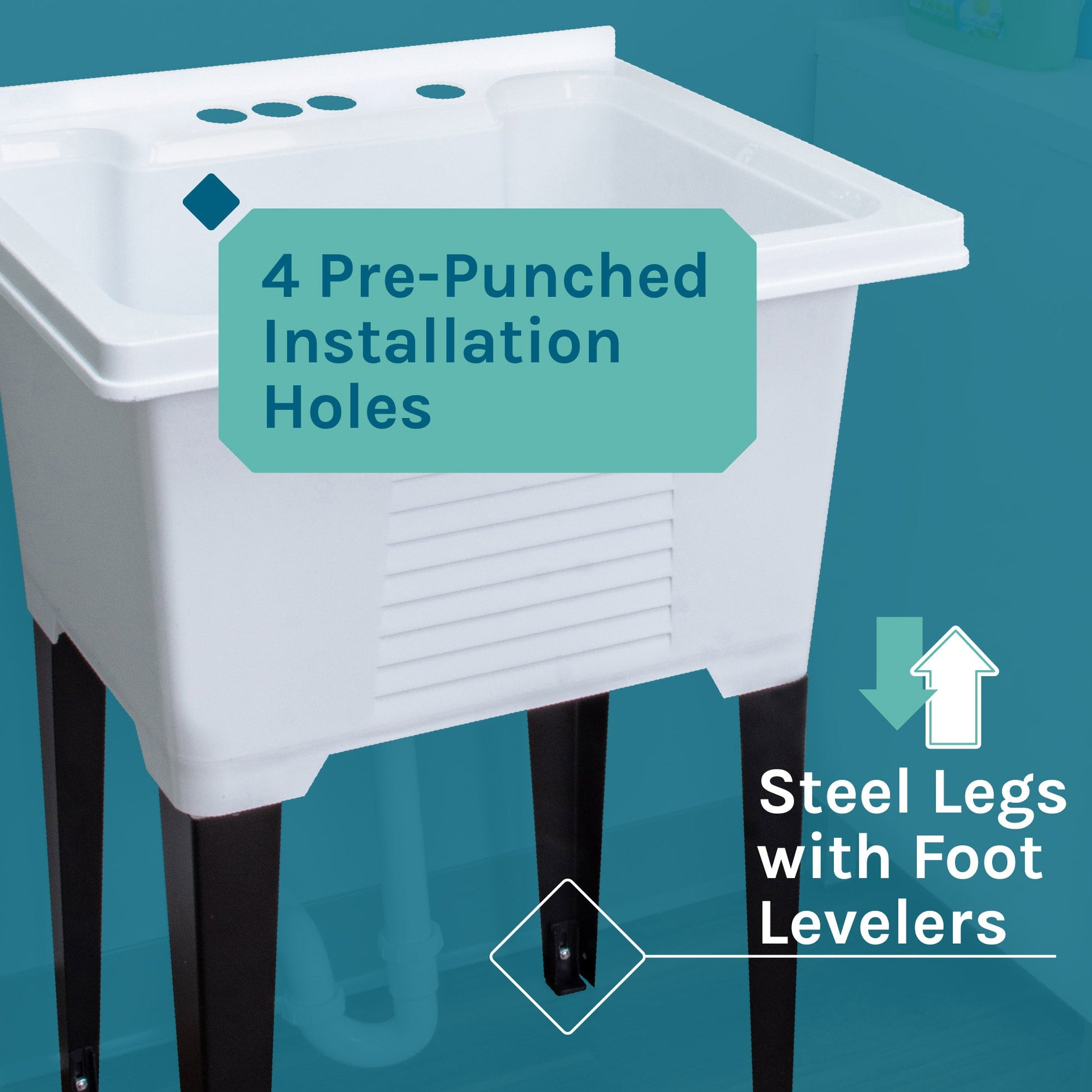 Our Luxe utility sink is not only beautiful, it is amazingly durable.Sturdy rust-proof steel legs attach easily, and the included floor levelers increase stability. Adjust foot levelers to the perfect height to level the tub on bumpy or uneven surfaces.