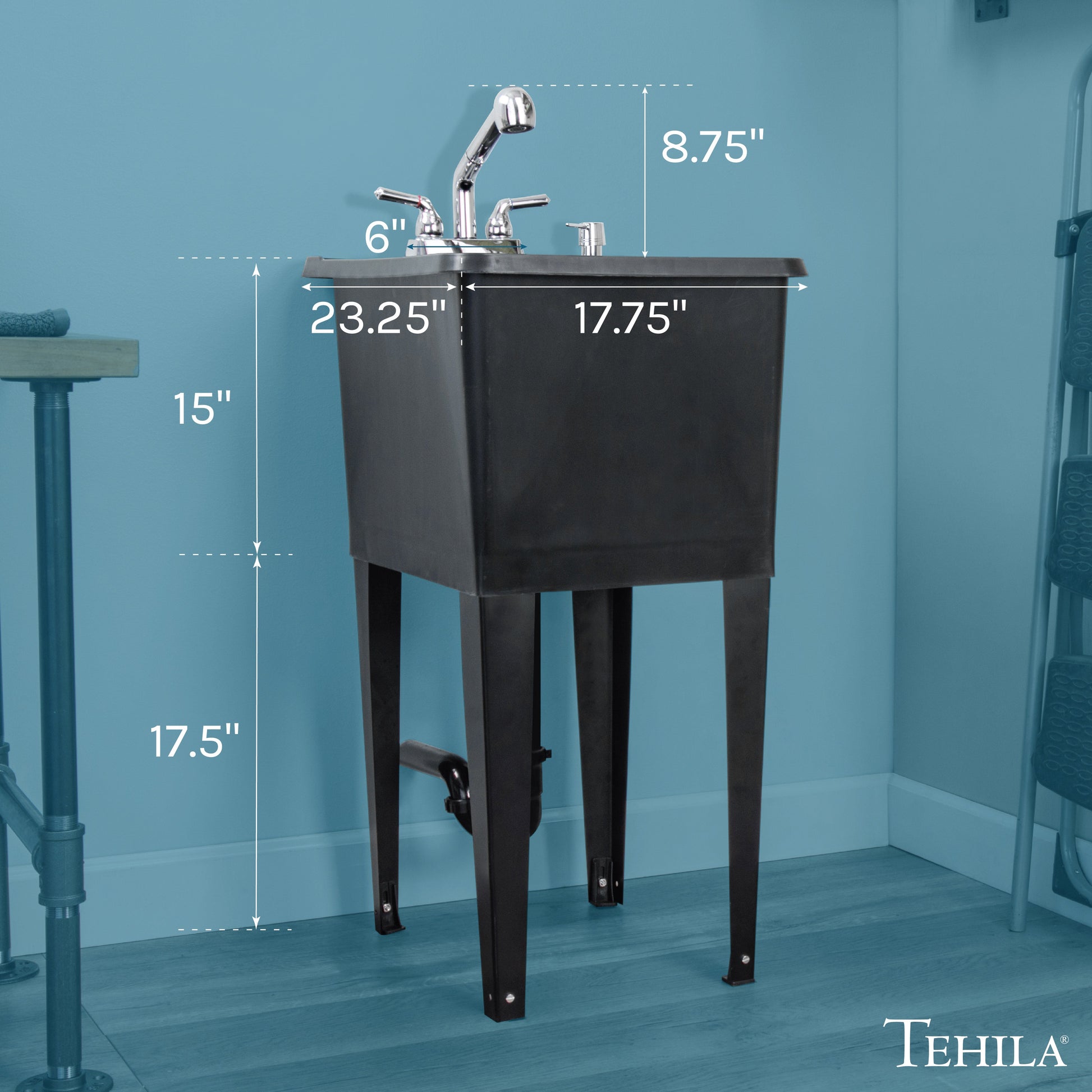 Tehila Space Saver Freestanding Black Utility Sink with Chrome Finish Pull-Out Faucet
