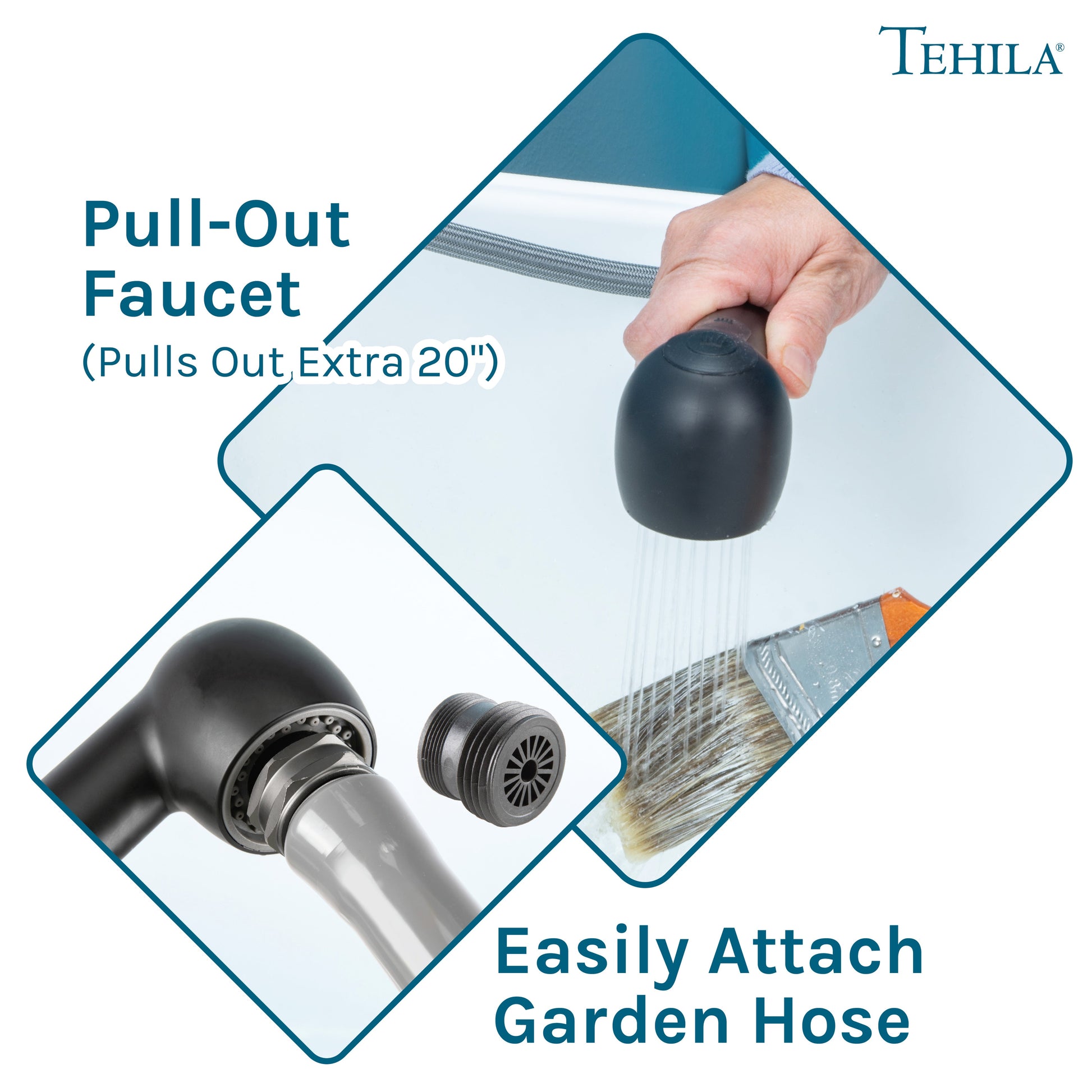 Tehila’s pull-out faucet was designed with you in mind. With the fully flexible pull-out sprayer hose, it’s easier than ever to wash dishes, soak clothes, or fill mop buckets. Dual handles ensure effortless temperature control, while clearly marked hot and cold symbols help you avoid confusion and make the faucet easy for kids to use. Choose from multiple color options for a stylish addition to any room, whether you’re replacing an existing faucet or setting up a new utility sink in your basement or garage.