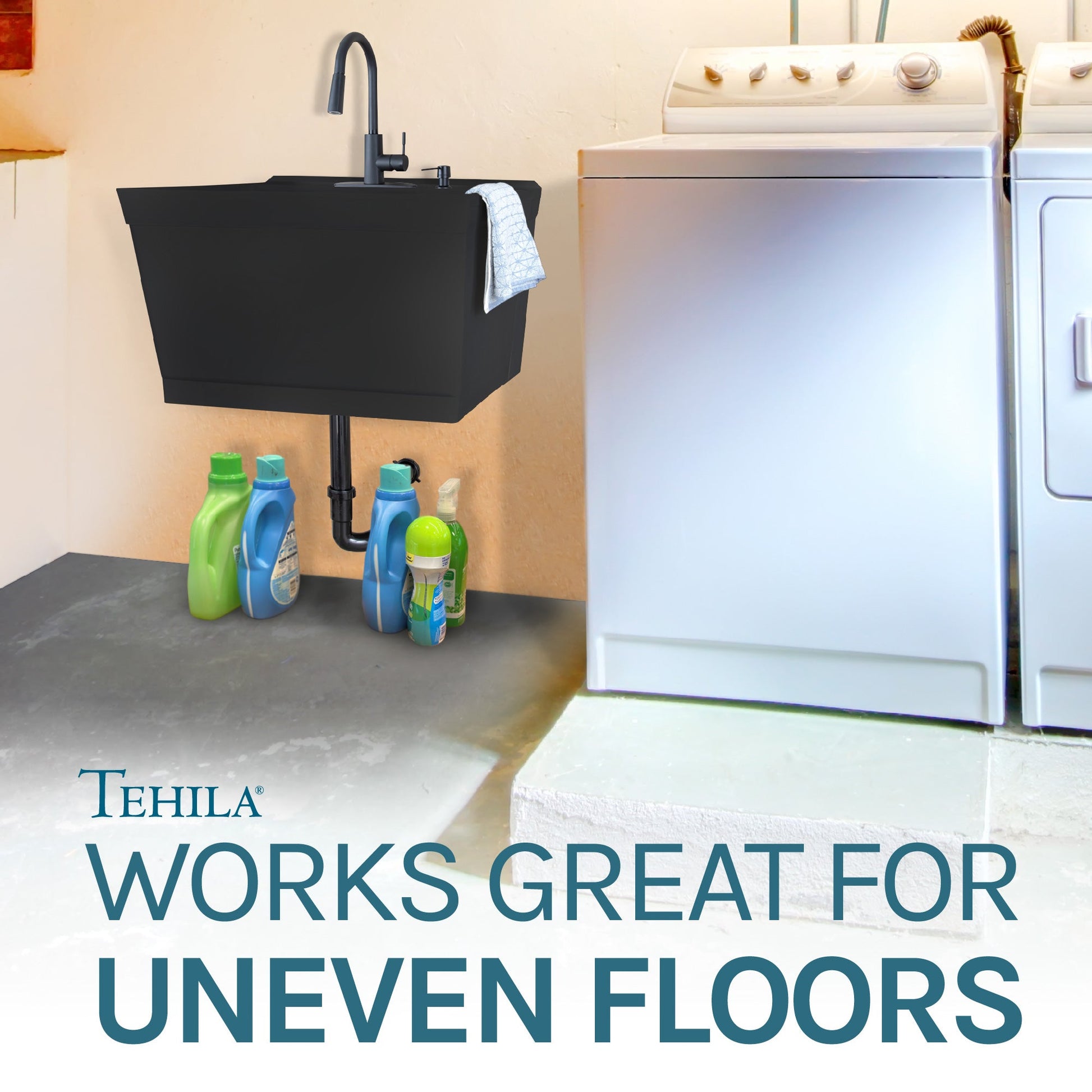 The Tehila floating tub kit’s wall-mounted design takes up less floor space than a standard utility sink, making it easy to clean. There are no legs to wipe down or to get in the way when cleaning the floor.