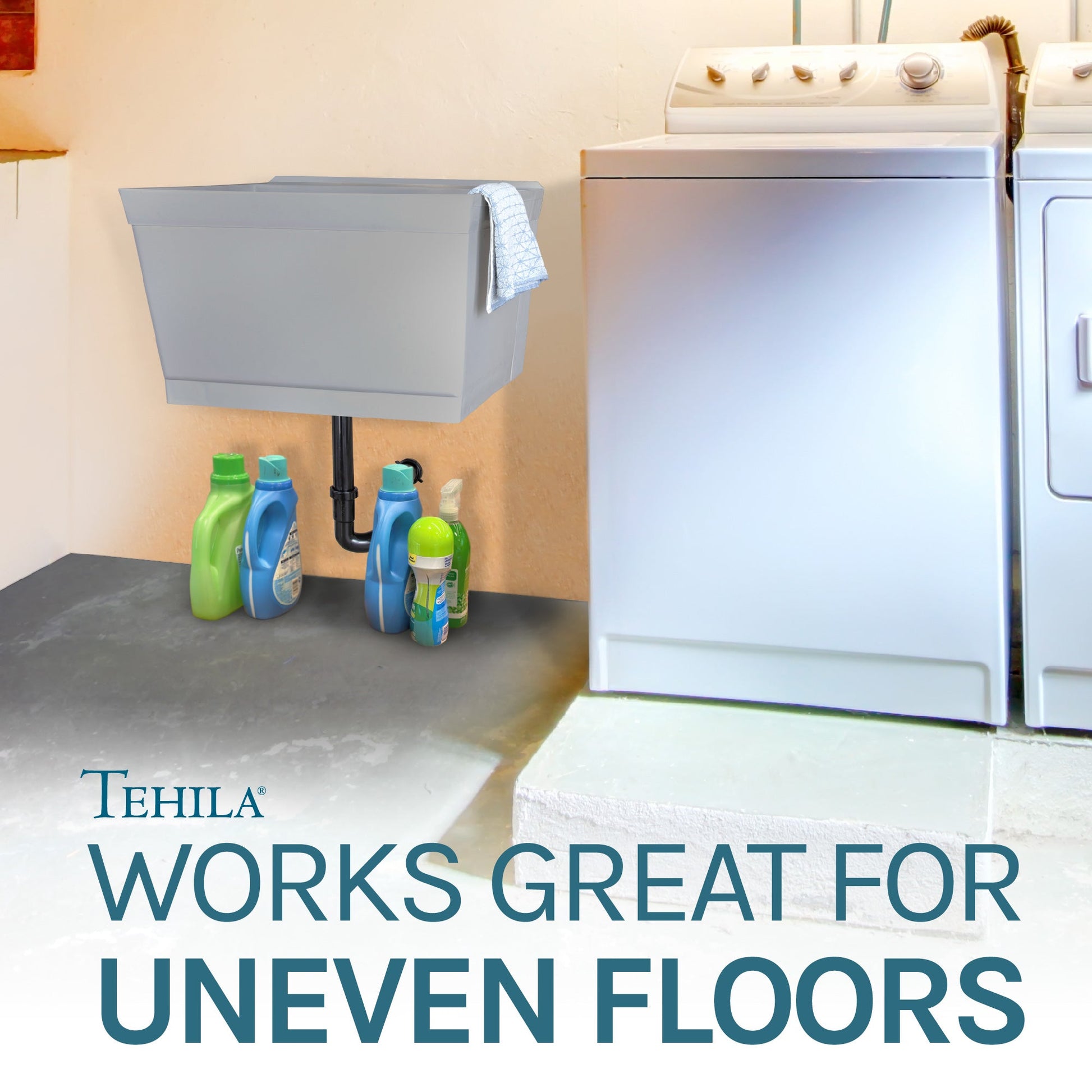 The Tehila floating tub kit’s wall-mounted design takes up less floor space than a standard utility sink, making it easy to clean. There are no legs to wipe down or to get in the way when cleaning the floor.