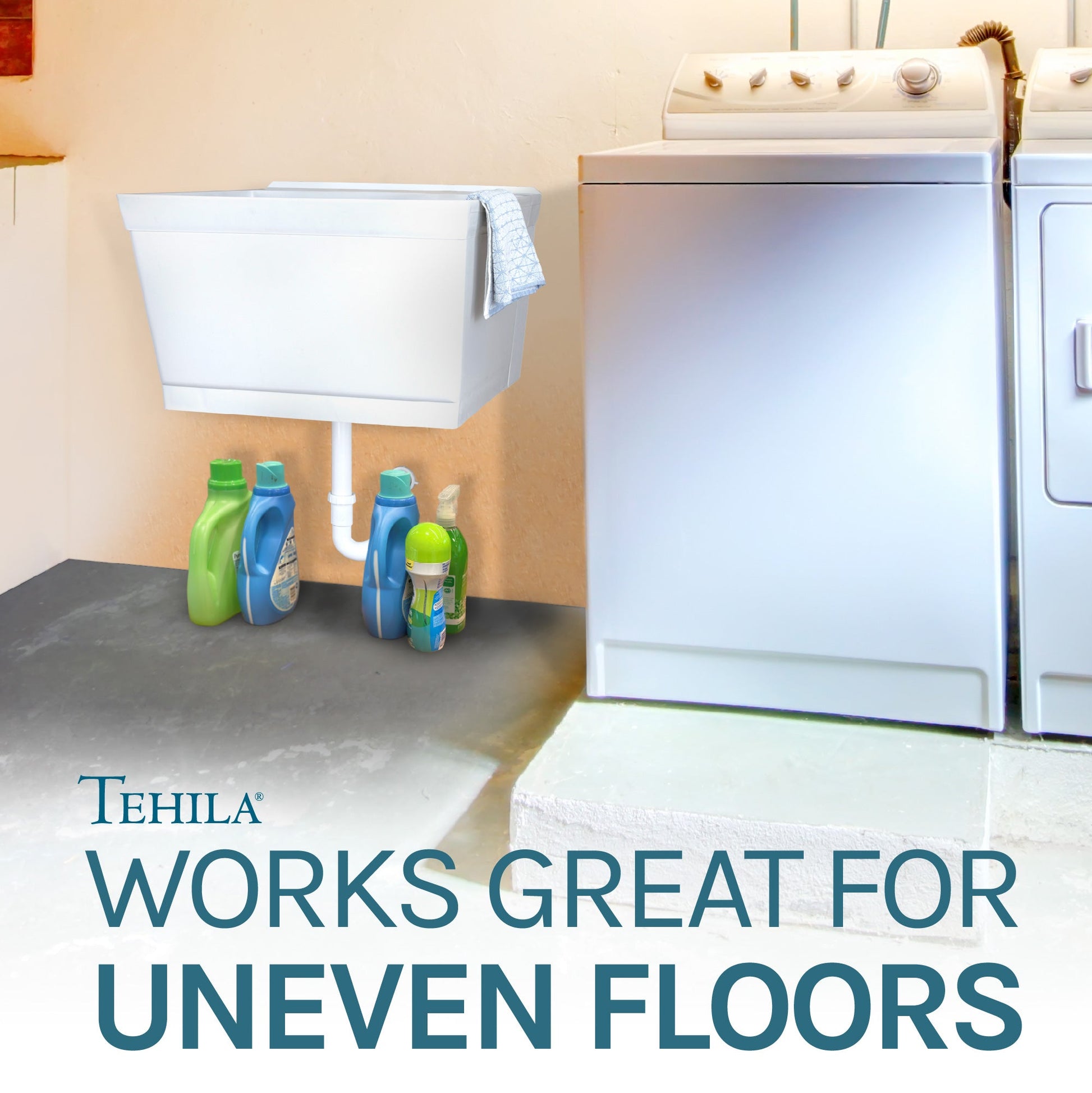 The Tehila floating tub kit’s wall-mounted design takes up less floor space than a standard utility sink, making it easy to clean. There are no legs to wipe down or to get in the way when cleaning the floor.