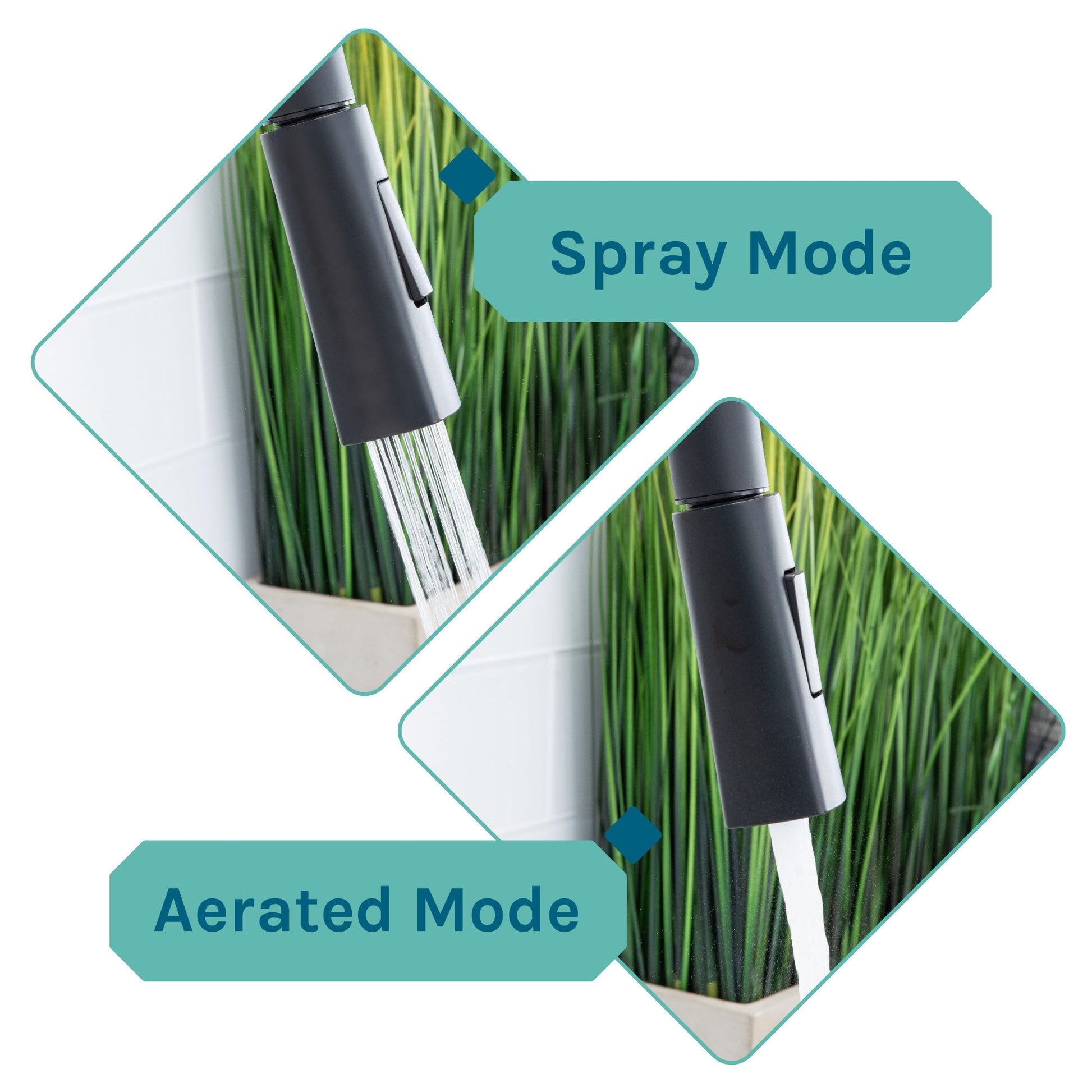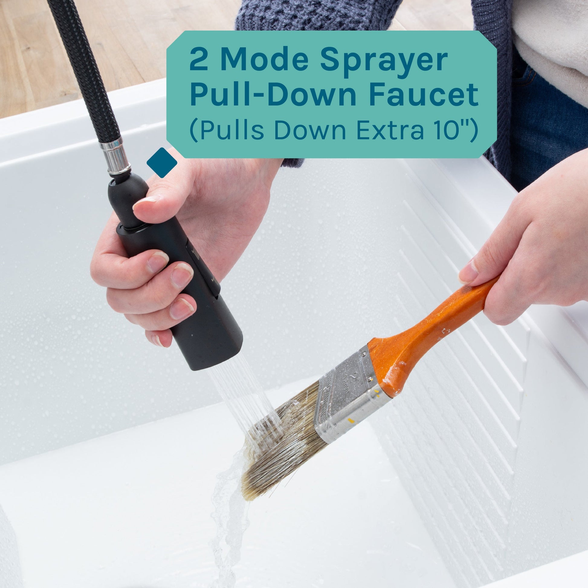 Our high-arc faucet gives you plenty of clearance for cleaning oversized items. The sprayer head features both stream and spray functions to help with filling and rinsing. This sprayer head pulls down to assist you with cleaning tools or hand-washing delicate laundry.