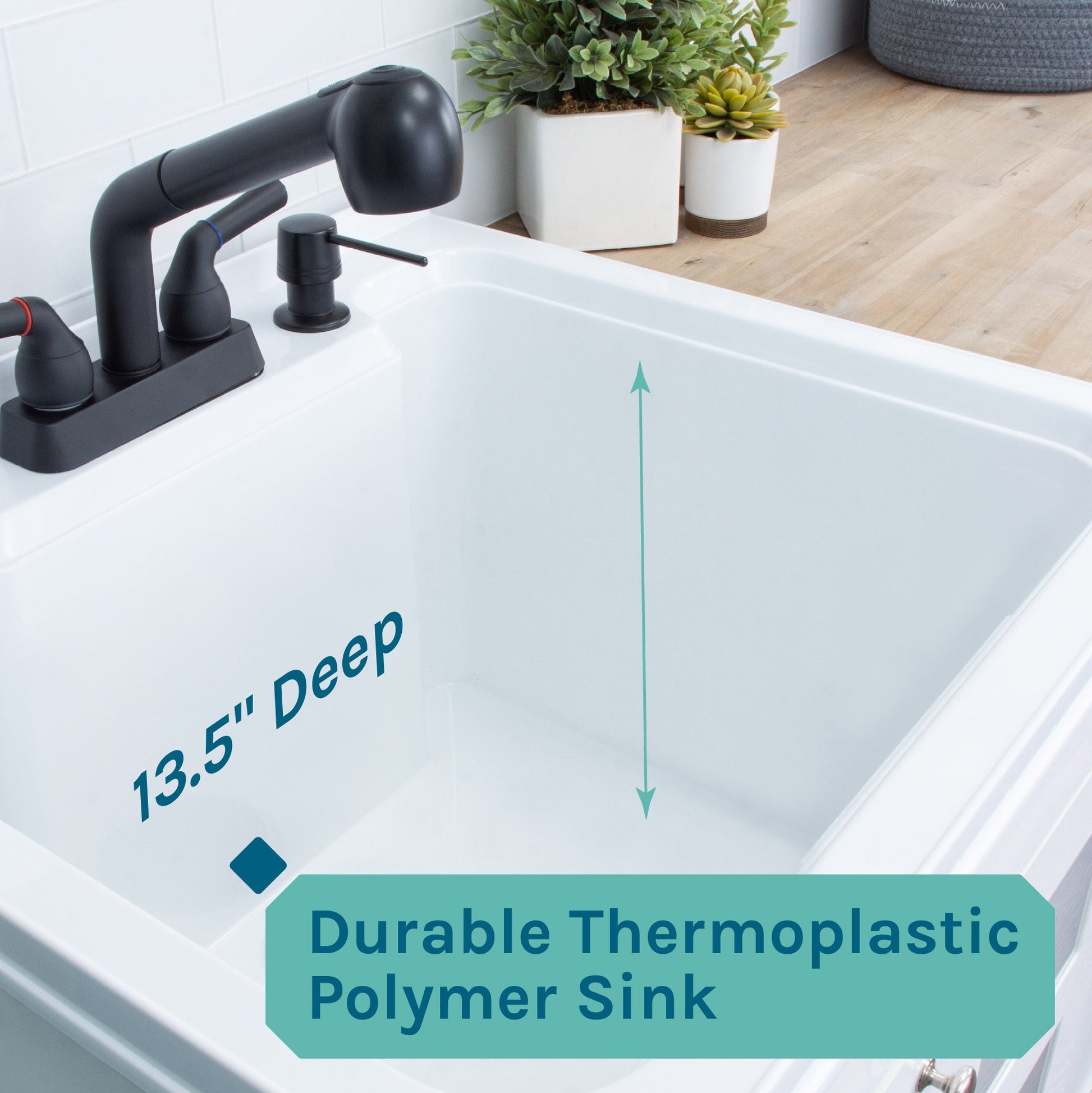 This fully assembled utility sink with cabinet, with its crisp white exterior and cut-out windows, easily matches your existing decor and quickly wipes clean with mild soap and warm water. Melamine coating makes the cabinet a smart choice for your laundry room.