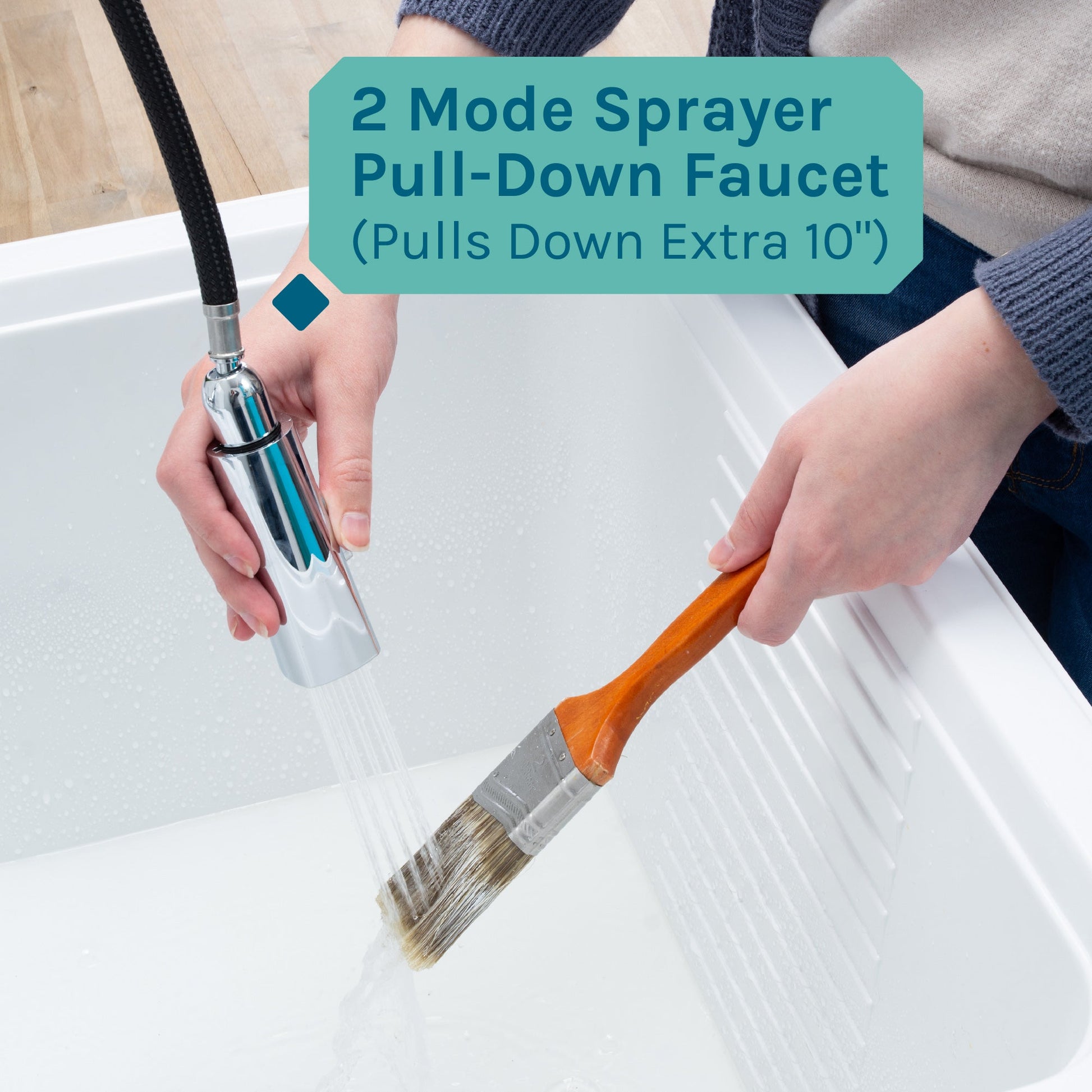 Our high-arc faucet gives you plenty of clearance for cleaning oversized items. The sprayer head features both stream and spray functions to help with filling and rinsing. This sprayer head pulls down to assist you with cleaning tools or hand-washing delicate laundry.