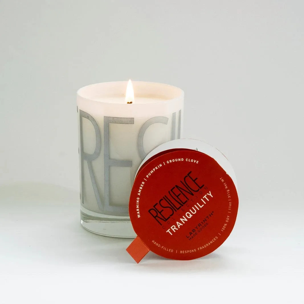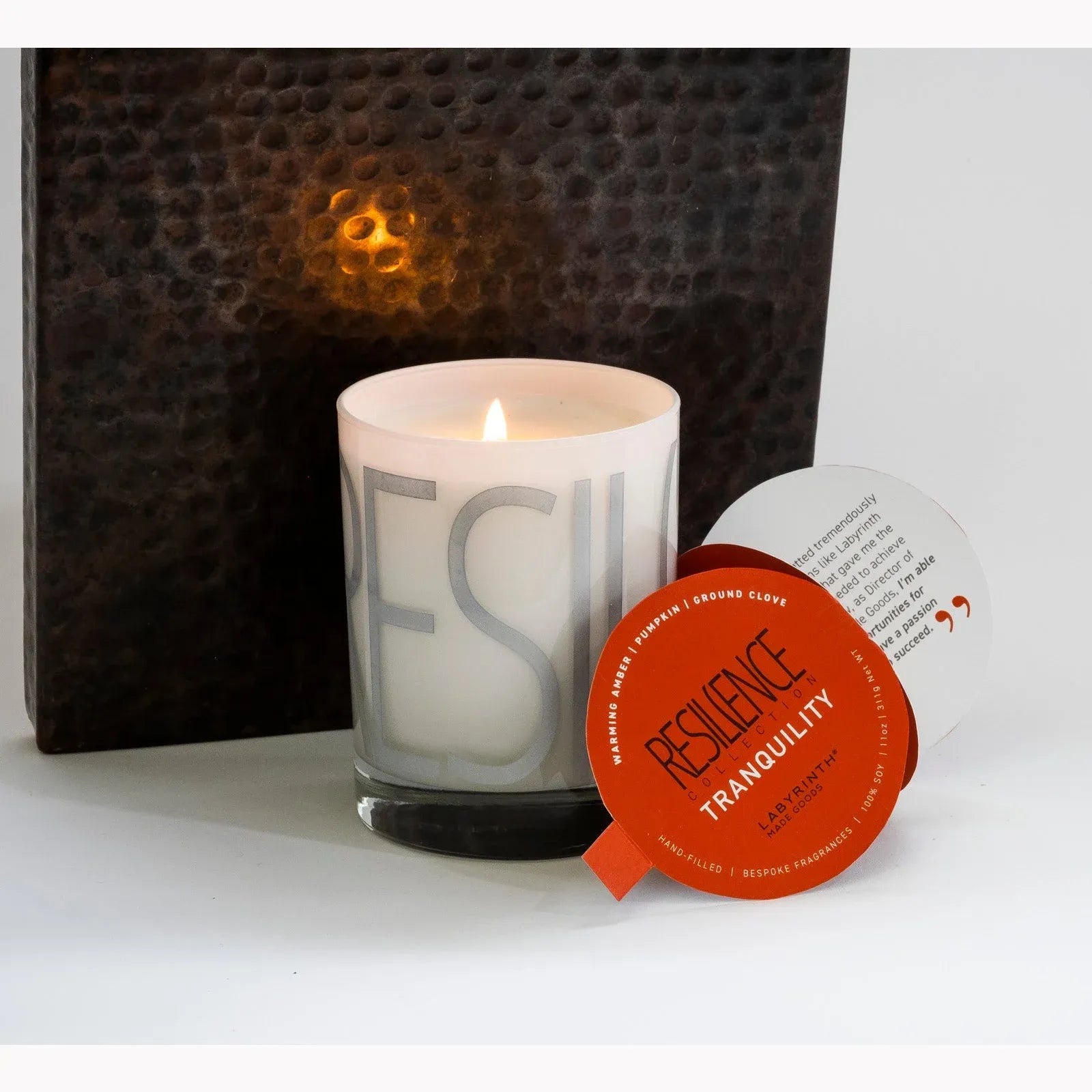 Our large Tranquility candle is filled in a beautiful, custom glass vessel with the word "Resilience" wrapped around to honor the resilience we can find within ourselves. Each of the larger candles has an estimated 60-hour burn time and a net weight of 11oz.