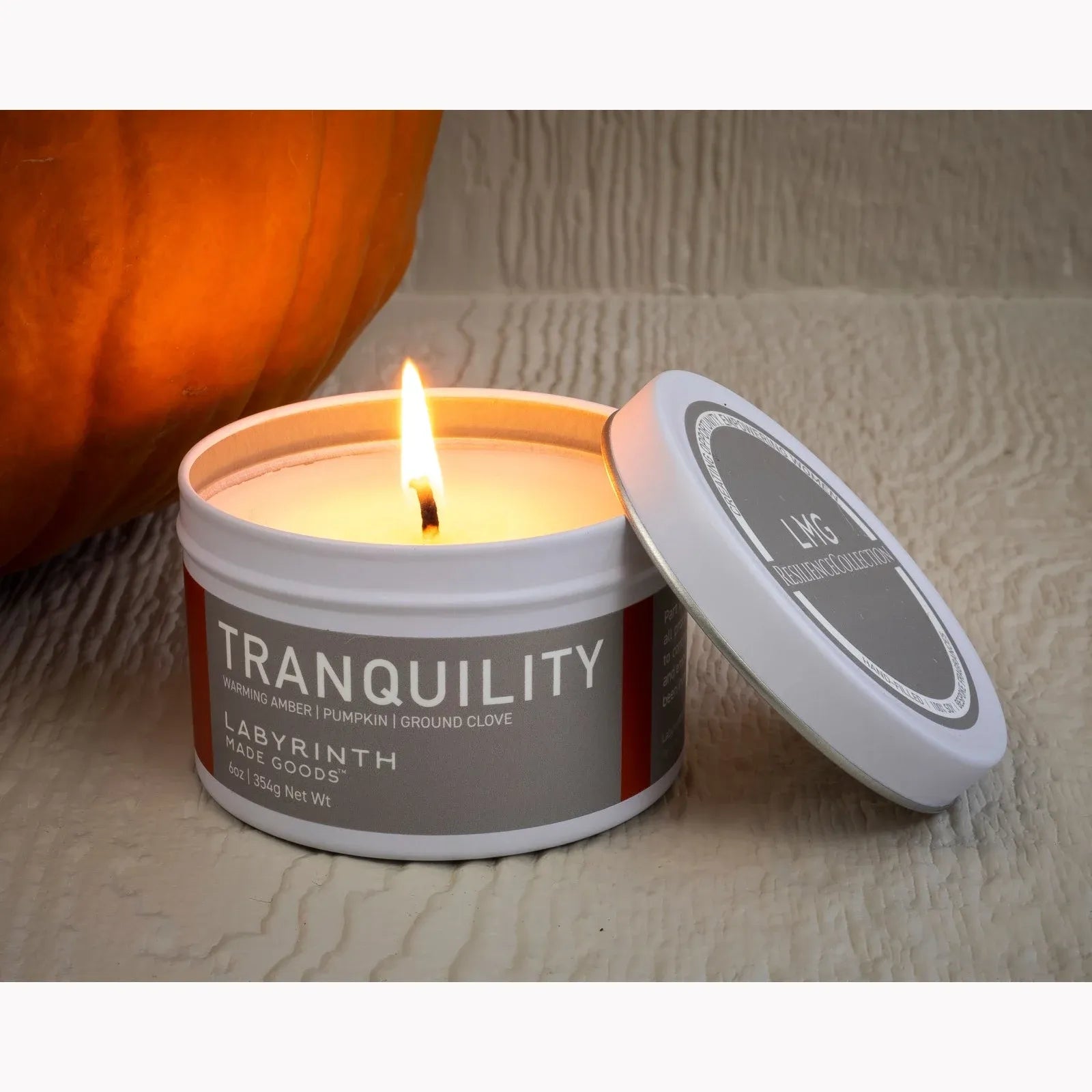 Our smaller Tranquility candle comes in a white tin for convenient travel. Each of the smaller candles has an estimated 35-hour burn time and a net weight of 6 oz.